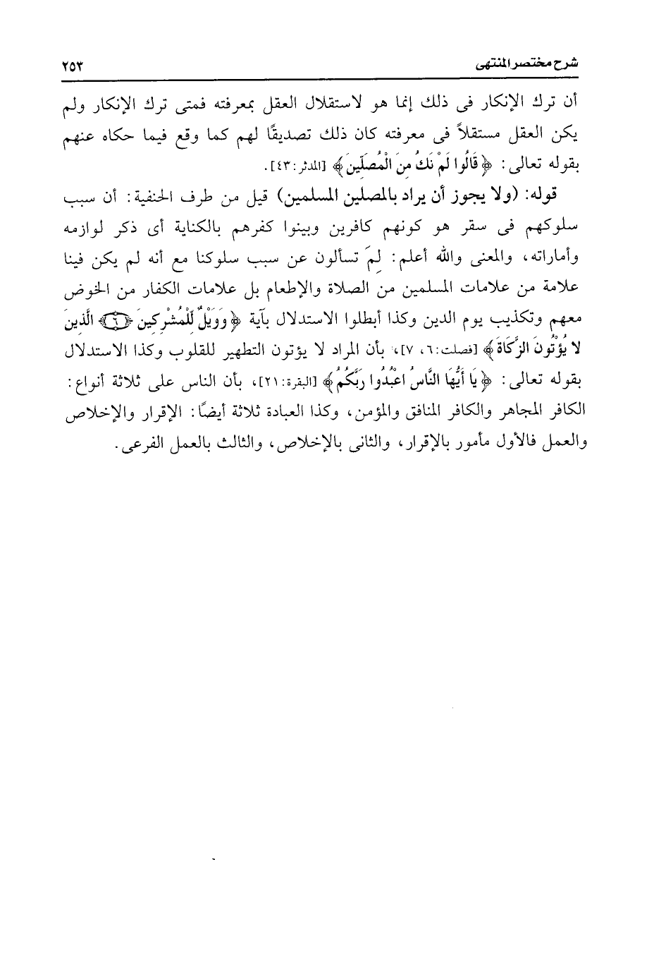 قوله: (ولا يجوز أن يراد بالمصلين المسلمين) قيل من طرف الحنفية: أن سبب سلوكهم فى سقر هو كونهم كافرين وبينوا كفرهم بالكناية أى ذكر لوازمه وأماراته، والمعنى واللَّه أعلم: لِمَ تسألون عن سبب سلوكنا مع أنه لم يكن فينا علامة من علامات المسلمين من الصلاة والإطعام بل علامات الكفار من الخوض معهم وتكذيب يوم الدين وكذا أبلطلوا الاستدلال بآية {وَوَيْلٌ لِلْمُشْرِكِينَ (٦) الَّذِينَ لَا يُؤْتُونَ الزَّكَاةَ} [فصلت: ٦، ٧]، بأن المراد لا يؤتون التطهير للقلوب وكذا الاستدلال بقوله تعالى: {يَاأَيُّهَا النَّاسُ اعْبُدُوا رَبَّكُمُ} [البقرة: ٢١]، بأن الناس على ثلاثة أنواع: الكافر المجاهر والكافر المنافق والمؤمن، وكذا العبادة ثلاثة أيضًا: الإقرار والإخلاص والعمل فالأول مأمور بالإقرار، والثانى بالإخلاص، والثالث بالعمل الفرعى.