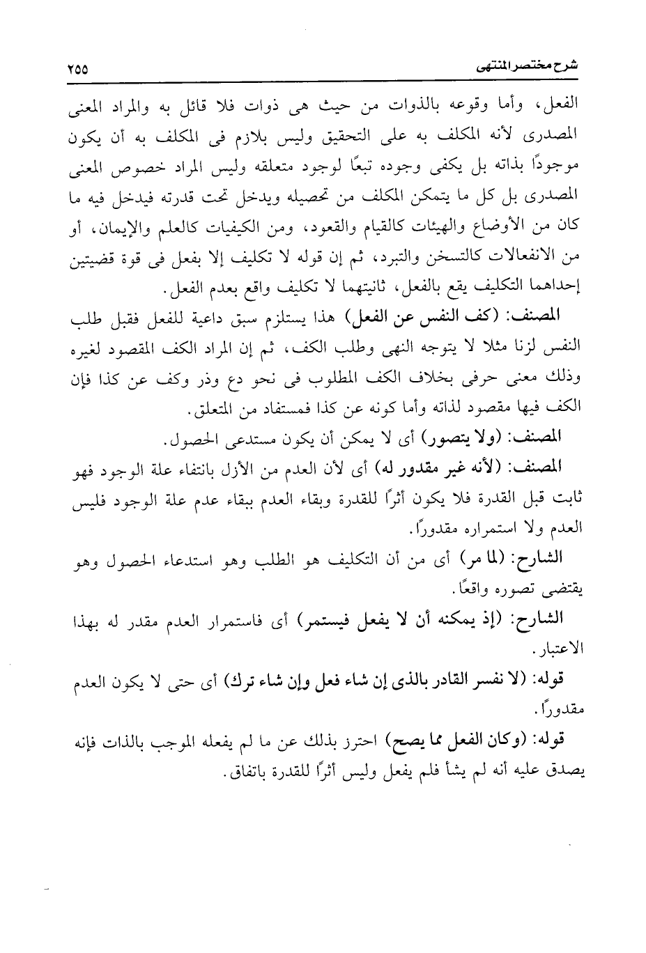 الفعل، وأما وقوعه بالذوات من حيث هى ذوات فلا قائل به والمراد المعنى المصدرى لأنه المكلف به على التحقيق وليس بلازم فى المكلف به أن يكون موجودًا بذاته بل يكفى وجوده تبعًا لوجود متعلقه وليس المراد خصوص المعنى المصدرى بل كل ما يتمكن المكلف من تحصيله ويدخل تحت قدرته فيدخل فيه ما كان من الأوضاع والهيئات كالقيام والقعود، ومن الكيفيات كالعلم والإيمان، أو من الانفعالات كالتسخن والتبرد، ثم إن قوله لا تكليف إلا بفعل فى قوة قضيتين إحداهما التكليف يقع بالفعل، ثانيتهما لا تكليف واقع بعدم الفعل.