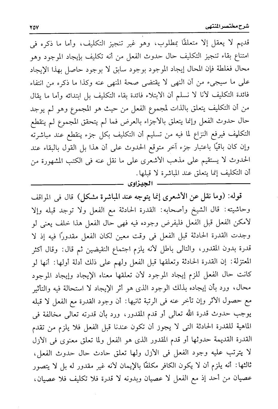 قوله: (وما نقل عن الأشعرى إنما يتوجه عند المباشرة مشكل) قال فى المواقف وحاشيته: قال الشيخ وأصحابه: القدرة الحادثة مع الفعل ولا توجد قبله وإلا لأمكن الفعل قبل الفعل فليفرض وجوده فيه فهى حال الفعل هذا خلف يعنى لو وجدت القدرة الحادثة قبل الفعل فى وقت معين لكان الفعل مقدورًا فيه إذ لا قدرة بدون المقدور، والتالى باطل لأنه يلزم اجتماع النقيضين ثم قال: وقال أكثر المعتزلة: إن القدرة الحادثة وتعلقها قبل الفعل ولهم على ذلك أدلة أولها: أنها لو كانت حال الفعل للزم إيجاد الموجود لأن تعلقها معناه الإيجاد وإيجاد الموجود محال، ورد بأن إيجاده بذلك الوجود الذى هو أثر الإيجاد لا استحالة فيه والتأثير مع حصول الأثر وإن تأخر عنه فى الرتبة ثانيها: أن وجود القدرة مع الفعل لا قبله يوجب حدوث قدرة اللَّه تعالى أو قدم المقدور، ورد بأن قدرته تعالى مخالفة فى الماهية للقدرة الحادثة التى لا يجوز أن تكون عندنا قبل الفعل فلا يلزم من تقدم القدرة القديمة حدوثها أو قدم المقدور الذى هو الفعل ولما تعلق معنوى فى الأزل لا يترتب عليه وجود الفعل فى الأزل ولها تعلق حادث حال حدوث الفعل، ثالثها: أنه يلزم أن لا يكون الكافر مكلفًا بالإيمان لأنه غير مقدور له بل لا يتصور عصيان من أحد إذ مع الفعل لا عصيان وبدونه لا قدرة فلا تكليف فلا عصيان،