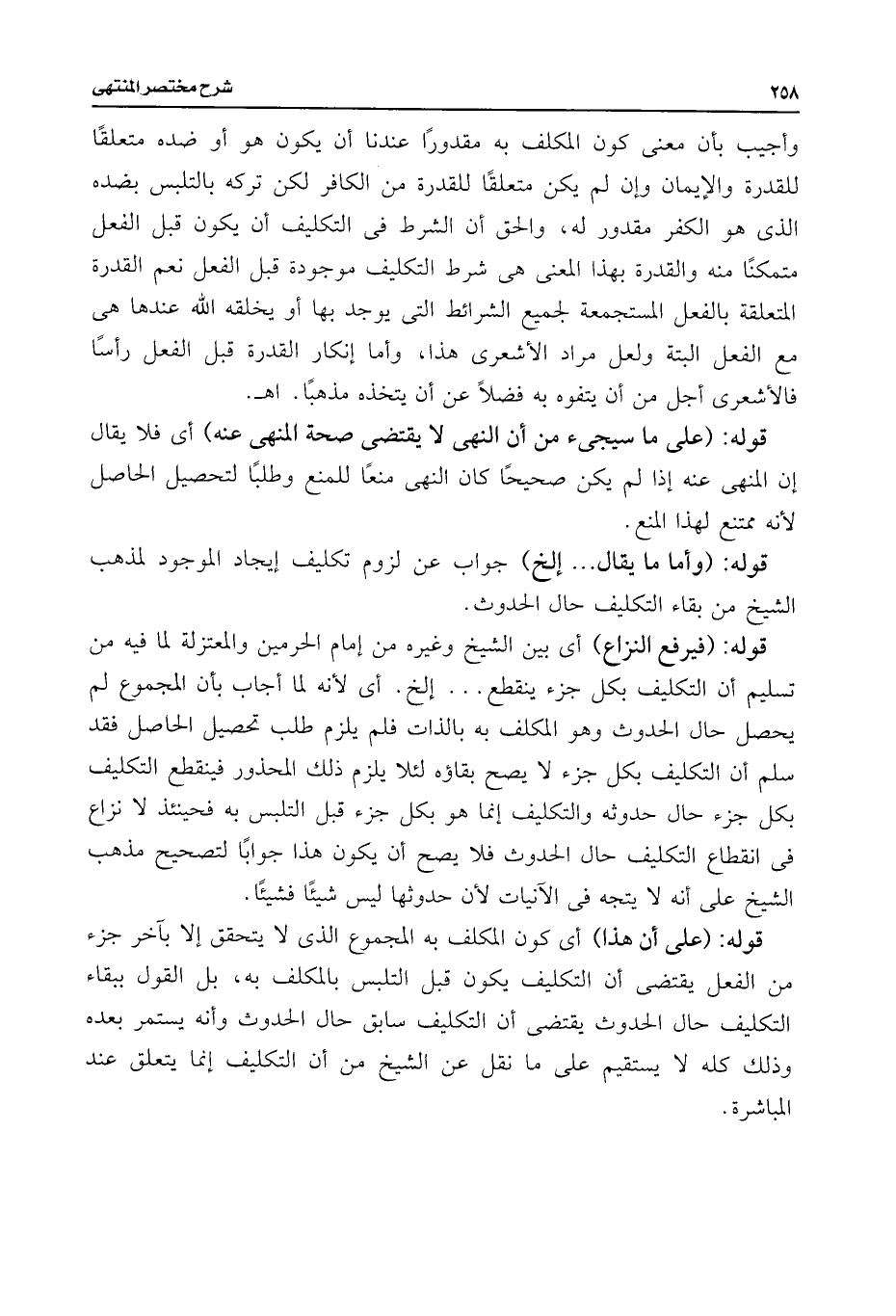 وأجيب بأن معنى كون المكلف به مقدورًا عندنا أن يكون هو أو ضده متعلقًا للقدرة والإيمان وإن لم يكن متعلقًا للقدرة من الكافر لكن تركه بالتلبس بضده الذى هو الكفر مقدور له، والحق أن الشرط فى التكليف أن يكون قبل الفعل متمكنًا منه والقدرة بهذا المعنى هى شرط التكليف موجودة قبل الفعل نعم القدرة المتعلقة بالفعل المستجمعة لجميع الشرائط التى يوجد بها أو يخلقه اللَّه عندها هى مع الفعل البتة ولعل مراد الأشعرى هذا، وأما إنكار القدرة قبل الفعل رأسًا فالأشعرى أجل من أن يتفوه به فضلًا عن أن يتخذه مذهبًا. اهـ.