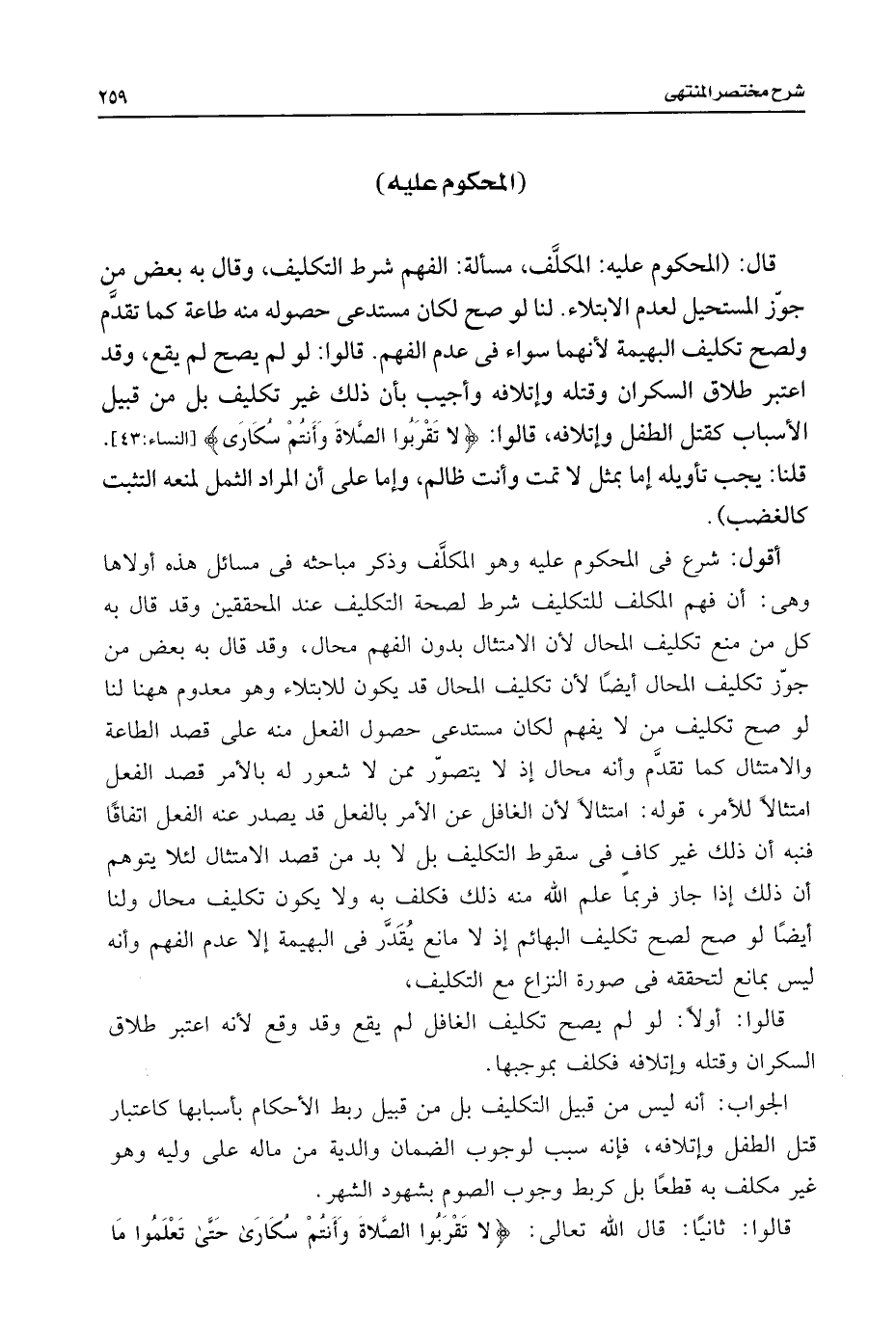 قال: (المحكوم عليه: المكلَّف، مسألة: الفهم شرط التكليف، وقال به بعض من جوّز المستحيل لعدم الابتلاء. لنا لو صح لكان مستدعى حصوله منه طاعة كما تقدَّم ولصح تكليف البهيمة لأنهما سواء فى عدم الفهم. قالوا: لو لم يصح لم يقع، وقد اعتبر طلاق السكران وقتله وإتلافه وأجيب بأن ذلك غير تكليف بل من قبيل الأسباب كقتل الطفل وإتلافه، قالوا: {لَا تَقْرَبُوا الصَّلَاةَ وَأَنْتُمْ سُكَارَى} [النساء: ٤٣]. قلنا: يجب تأويله إما بمثل لا تمت وأنت ظالم، وإما على أن المراد الثمل لمنعه التثبت كالغضب).