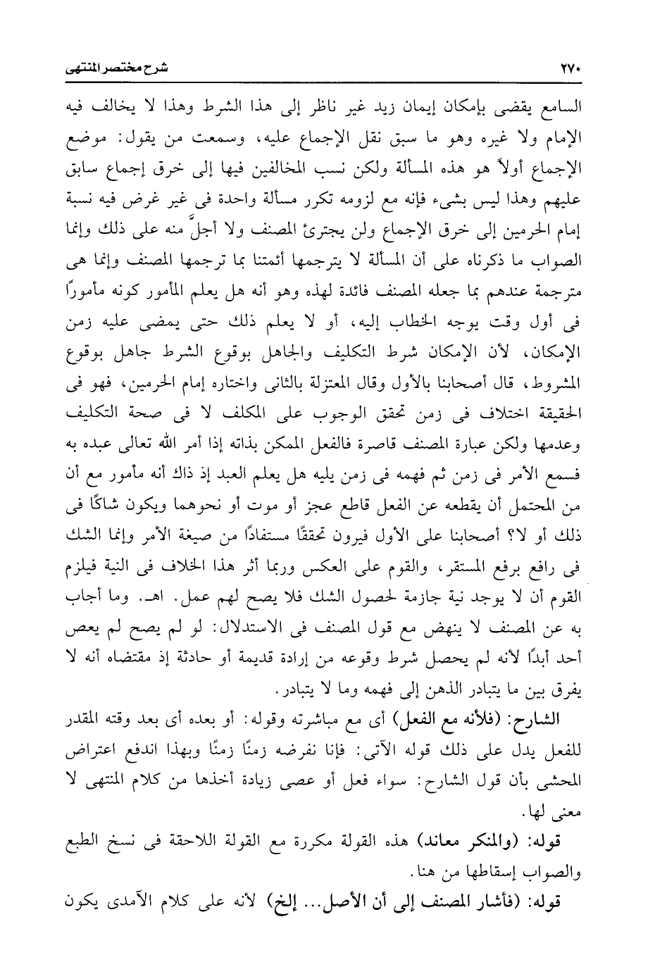 السامع يقضى بإمكان إيمان زيد غير ناظر إلى هذا الشرط وهذا لا يخالف فيه الإمام ولا غيره وهو ما سبق نقل الإجماع عليه، وسمعت من يقول: موضع الإجماع أولًا هو هذه المسألة ولكن نسب المخالفين فيها إلى خرق إجماع سابق عليهم وهذا ليس بشئ فإنه مع لزومه تكرر مسألة واحدة فى غير غرض فيه نسبة إمام الحرمين إلى خرق الإجماع ولن يجترئ المصنف ولا أجلَّ منه على ذلك وإنما الصواب ما ذكرناه على أن المسألة لا يترجمها أئمتنا بما ترجمها المصنف وإنما هى مترجمة عندهم بما جعله المصنف فائدة لهذه وهو أنه هل يعلم المأمور كونه مأمورًا فى أول وقت يوجه الخطاب إليه، أو لا يعلم ذلك حتى يمضى عليه زمن الإمكان، لأن الإمكان شرط التكليف والجاهل بوقوع الشرط جاهل بوقوع المشروط، قال أصحابنا بالأول وقال المعتزلة بالثانى واختاره إمام الحرمين، فهو فى الحقيقة اختلاف فى زمن تحقق الوجوب على المكلف لا فى صحة التكليف وعدمها ولكن عبارة المصنف قاصرة فالفعل الممكن بذاته إذا أمر اللَّه تعالى عبده به فسمع الأمر فى زمن ثم فهمه فى زمن يليه هل يعلم العبد إذ ذاك أنه مأمور مع أن من المحتمل أن يقطعه عن الفعل قاطع عجز أو موت أو نحوهما ويكون شاكًا فى ذلك أو لا؟ أصحابنا على الأول فيرون تحققًا مستفادًا من صيغة الأمر وإنما الشك فى رافع برفع المستقر، والقوم على العكس وربما أثر هذا الخلاف فى النية فيلزم القوم أن لا يوجد نية جازمة لحصول الشك فلا يصح لهم عمل. اهـ. وما أجاب به عن المصنف لا ينهض مع قول المصنف فى الاستدلال: لو لم يصح لم يعص أحد أبدًا لأنه لم يحصل شرط وقوعه من إرادة قديمة أو حادثة إذ مقتضاه أنه لا يفرق بين ما يتبادر الذهن إلى فهمه وما لا يتبادر.