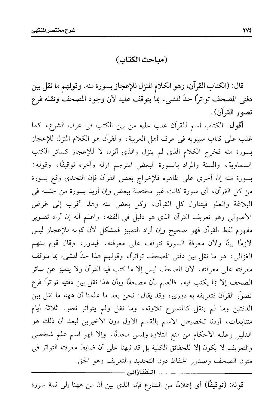 قال: (الكتاب القرآن، وهو الكلام المنزل للإعجاز بسورة منه. وقولهم ما نقل بين دفتى المصحف تواترًا حدّ للشئ بما يتوقف عليه لأن وجود المصحف ونقله فرع تصور القرآن).