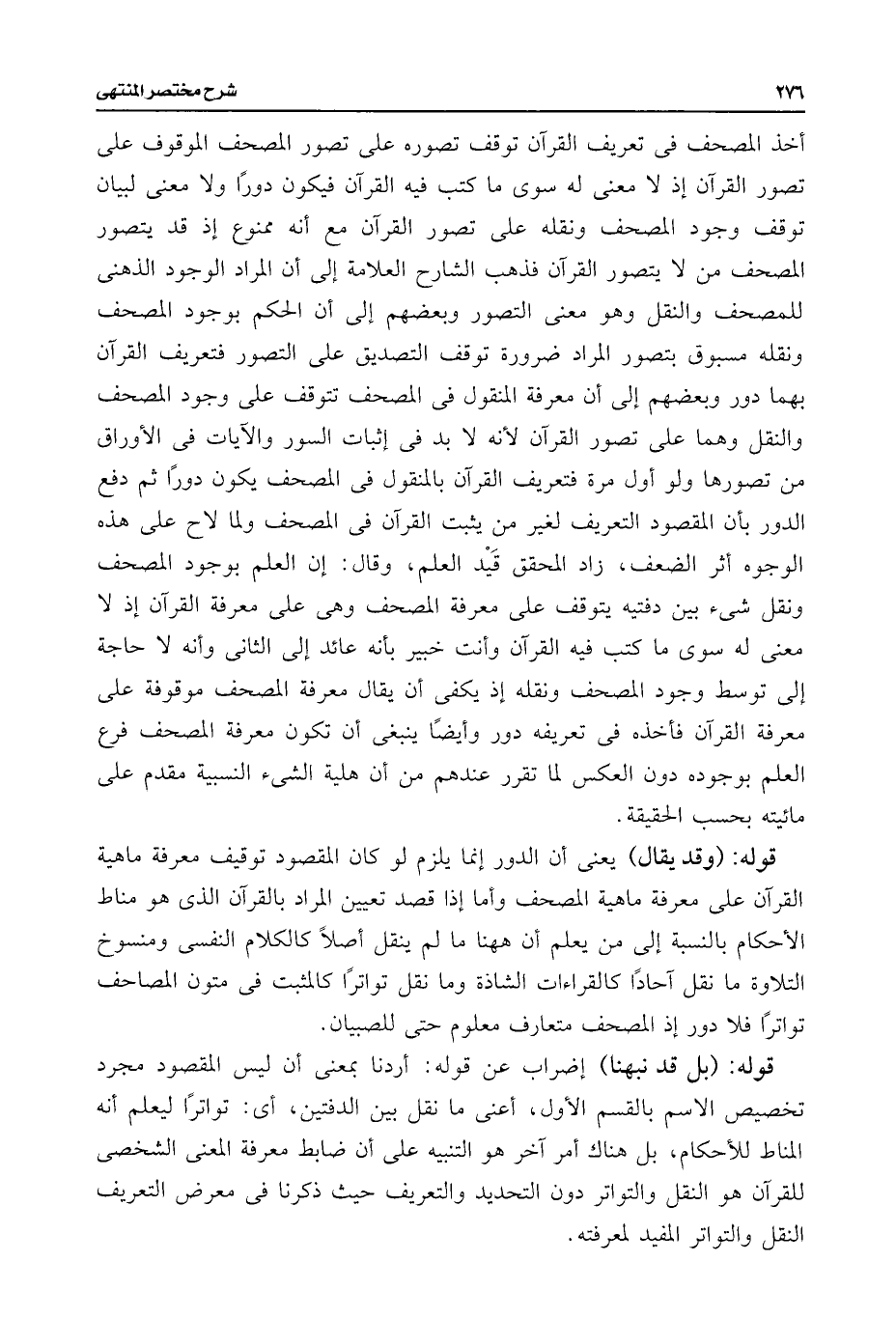 أخذ المصحف فى تعريف القرآن توقف تصوره على تصور المصحف الموقوف على تصور القرآن إذ لا معنى له سوى ما كتب فيه القرآن فيكون دورًا ولا معنى لبيان توقف وجود المصحف ونقله على تصور القرآن مع أنه ممنوع إذ قد يتصور المصحف من لا يتصور القرآن فذهب الشارح العلامة إلى أن المراد الوجود الذهنى للمصحف والنقل وهو معنى التصور وبعضهم إلى أن الحكم بوجود المصحف ونقله مسبوق بتصور المراد ضرورة توقف التصديق على التصور فتعريف القرآن بهما دور وبعضهم إلى أن معرفة المنقول فى المصحف تتوقف على وجود المصحف والنقل وهما على تصور القرآن لأنه لا بد فى إثبات السور والآيات فى الأوراق من تصورها ولو أول مرة فتعريف القرآن بالمنقول فى المصحف يكون دورًا ثم دفع الدور بأن المقصود التعريف لغير من يثبت القرآن فى المصحف ولما لاح على هذه الوجوه أثر الضعف، زاد المحقق قَيْد العلم، وقال: إن العلم بوجود المصحف ونقل شئ بين دفتيه يتوقف على معرفة المصحف وهى على معرفة القرآن إذ لا معنى له سوى ما كتب فيه الؤآن وأنت خبير بأنه عائد إلى الثانى وأنه لا حاجة إلى توسط وجود المصحف ونقله إذ يكفى أن يقال معرفة المصحف موقوفة على معرفة القرآن فأخذه فى تعريفه دور وأيضًا ينبغى أن تكون معرفة المصحف فرع العلم بوجوده دون العكس لما تقرر عندهم من أن هلية الشئ النسبية مقدم على مائيته بحسب الحقيقة.