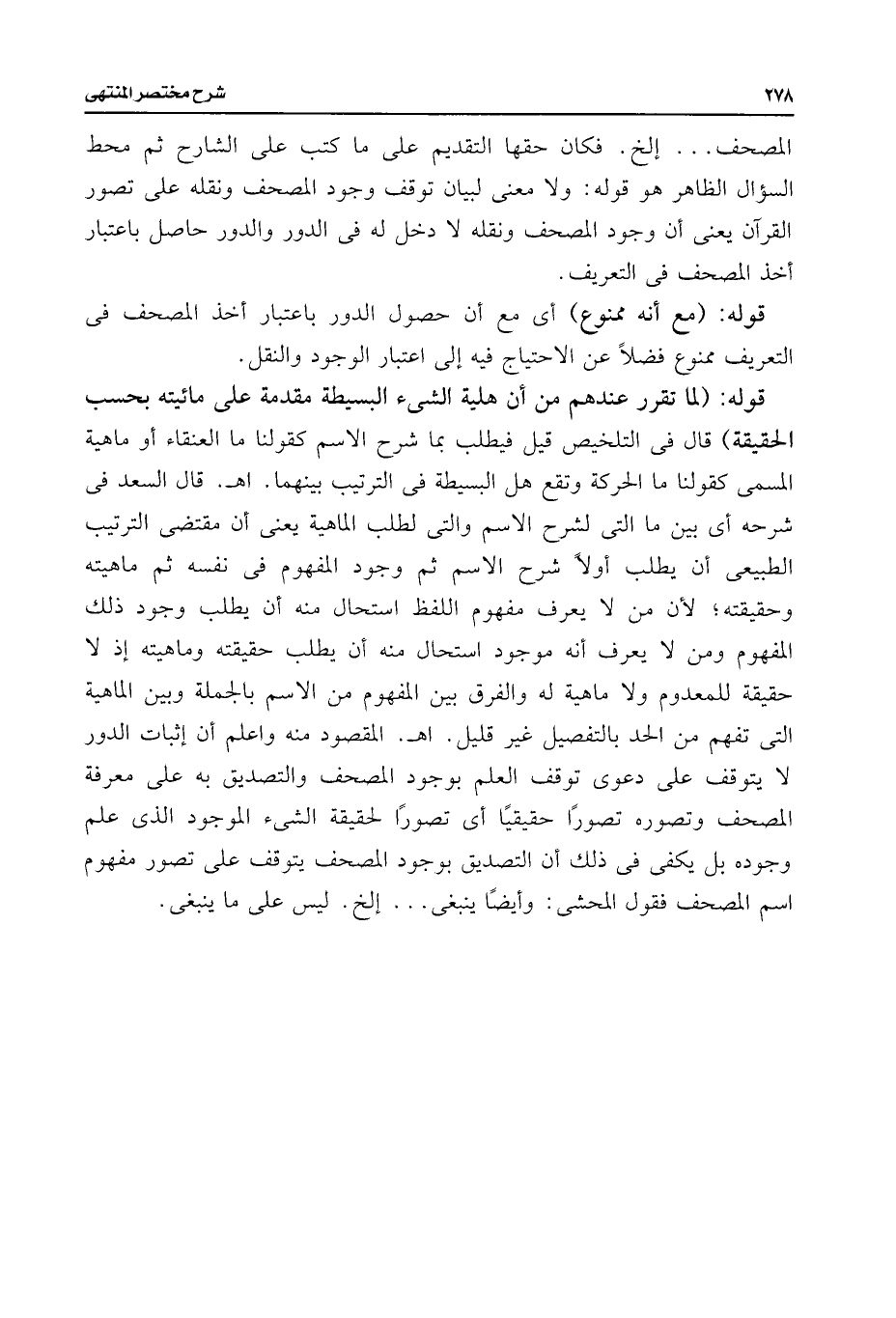 قوله: (لما تقرر عندهم من أن هلية الشئ البسيطة مقدمة على مائيته بحسب الحقيقة) قال فى التلخيص قيل فيطلب بما شرح الاسم كقولنا ما العنقاء أو ماهية المسمى كقولنا ما الحركة وتقع هل البسيطة فى الترتيب بينهما. اهـ. قال السعد فى شرحه أى بين ما التى لشرح الاسم والتى لطلب الماهية يعنى أن مقتضى الترتيب الطبيعى أن يطلب أولًا شرح الاسم ثم وجود المفهوم فى نفسه ثم ماهيته وحقيقته؛ لأن من لا يعرف مفهوم اللفظ استحال منه أن يطلب وجود ذلك المفهوم ومن لا يعرف أنه موجود استحال منه أن يطلب حقيقته وماهيته إذ لا حقيقة للمعدوم ولا ماهية له والفرق بين المفهوم من الاسم بالجملة وبين الماهية التى تفهم من الحد بالتفصيل غير قليل. اهـ. المقصود منه واعلم أن إثبات الدور لا يتوقف على دعوى توقف العلم بوجود الصحف والتصديق به على معرفة المصحف وتصوره تصورًا حقيقيًا أى تصورًا لحقيقة الشئ الموجود الذى علم وجوده بل يكفى فى ذلك أن التصديق بوجود المصحف يتوفت على تصور مفهوم اسم المصحف فقول المحشى: وأيضًا ينبغى. . . إلخ. ليس على ما ينبغى.