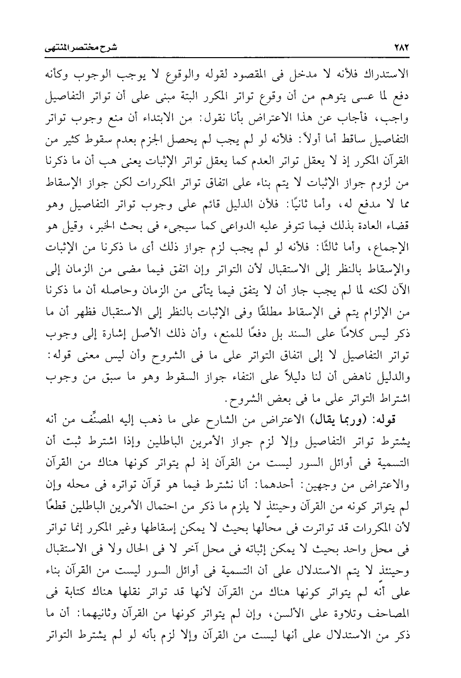 قوله: (وربما يقال) الاعتراض من الشارح على ما ذهب إليه المصنف من أنه يشترط تواتر التفاصيل وإلا لزم جواز الأمرين الباطلين وإذا اشترط ثبت أن التسمية فى أوائل السور ليست من القرآن إذ لم يتواتر كونها هناك من القرآن والاعتراض من وجهين: أحدهما: أنا نشترط فيما هو قرآن تواتره فى محله وإن لم يتواتر كونه من القرآن وحينئذٍ لا يلزم ما ذكر من احتمال الأمرين الباطلين قطعًا لأن المكررات قد تواترت فى محالها بحيث لا يمكن إسقاطها وغير المكرر إنما تواتر فى محل واحد بحيث لا يمكن إثباته فى محل آخر لا فى الحال ولا فى الاستقبال وحينئذٍ لا يتم الاستدلال على أن التسيية فى أوائل السور ليست من القرآن بناء على أنه لم يتواتر كونها هناك من القرآن لأنها قد تواتر نقلها هناك كتابة فى المصاحف وتلاوة على الألسن، وإن لم يتواتر كونها من القرآن وثانيهما: أن ما ذكر من الاستدلال على أنها ليست من القرآن وإلا لزم بأنه لو لم يشترط التواتر