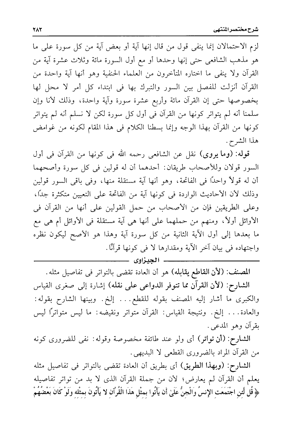 لزم الاحتمالان إنما ينفى قول من قال إنها آية أو بعض آية من كل سورة على ما هو مذهب الشافعى حتى إنها وحدها أو مع أول السورة مائة وثلاث عشرة آية من القرآن ولا ينفى ما اختاره المتأخرون من العلماء الحنفية وهو أنها آية واحدة من القرآن أنزلت للفصل بين السور والتبرك بها فى ابتداء كل أمر لا محل لها بخصوصها حتى إن القرآن مائة وأربع سورة سورة وآية واحدة، وذلك لأنا وإن سلمنا أنه لم يتواتر كونها من القرآن فى أول كل سورة لكن لا نسلم أنه لم يتواتر كونها من القرآن بهذا الوجه وإنما بسطنا الكلام فى هذا القام لكونه من غوامض هذا الشرح.