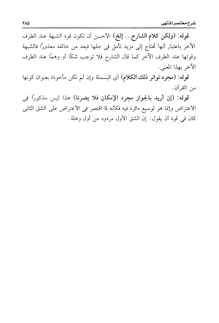 قوله: (ولكن كلام الشارح. . . إلخ) الأحسن أن تكون قوة الشبهة عند الطرف الآخر باعتبار أنها تحتاج إلى مزيد تأمل فى جلها فيعد من خالفه معذورًا فالشبهة وقوتها عند الطرف الآخر كما قال الشارح فلا توجب شكًا أو وهمًا عند الطرف الآخر بهذا المعنى.