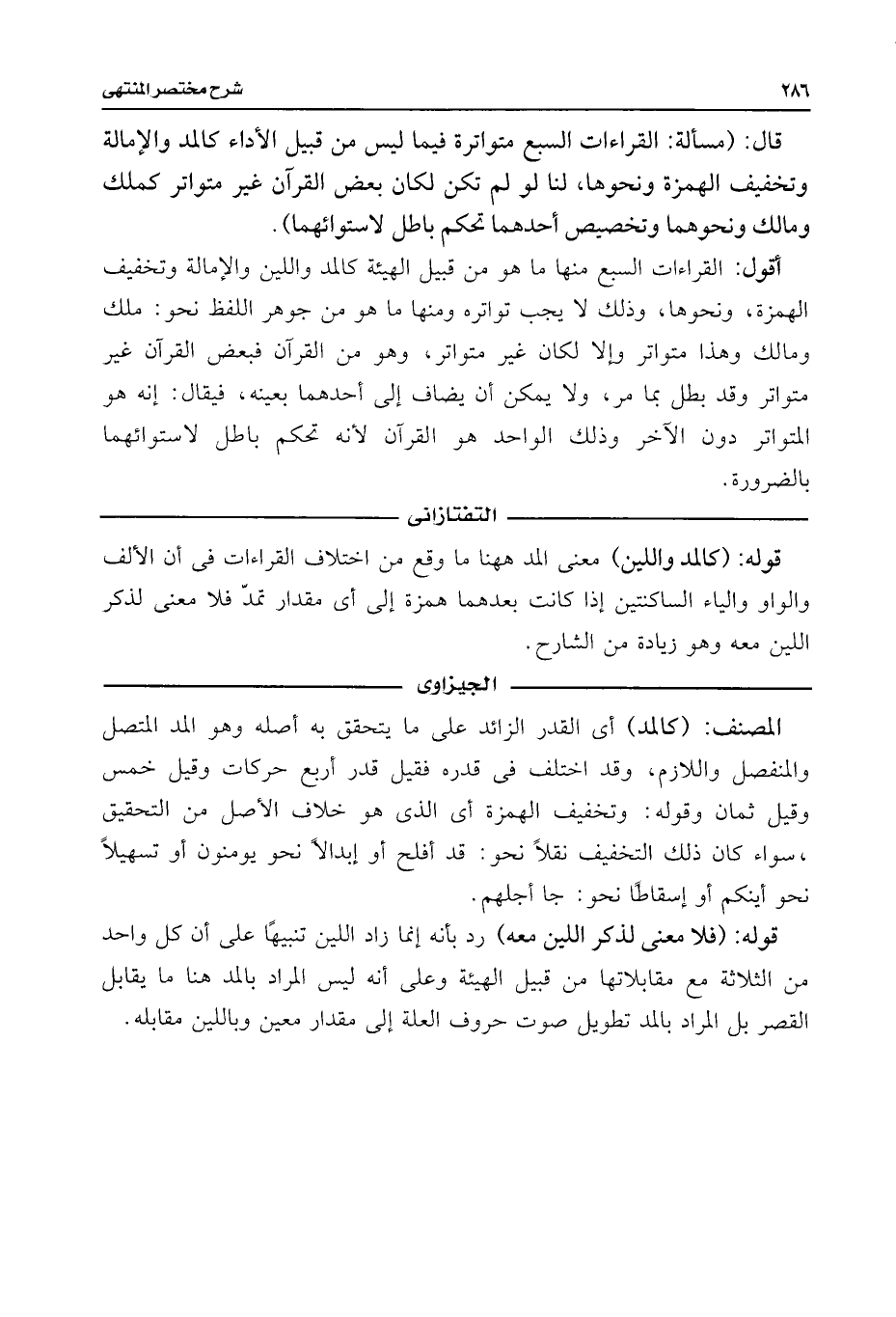 قال: (مسألة: القراءات السبع متواترة فيما ليس من قبيل الأداء كالمد والإمالة وتخفيف الهمزة ونحوها، لنا لو لم تكن لكان بعض القرآن غير متواتر كملك ومالك ونحوهما وتخصيص أحدهما تحكم باطل لاستوائهما).