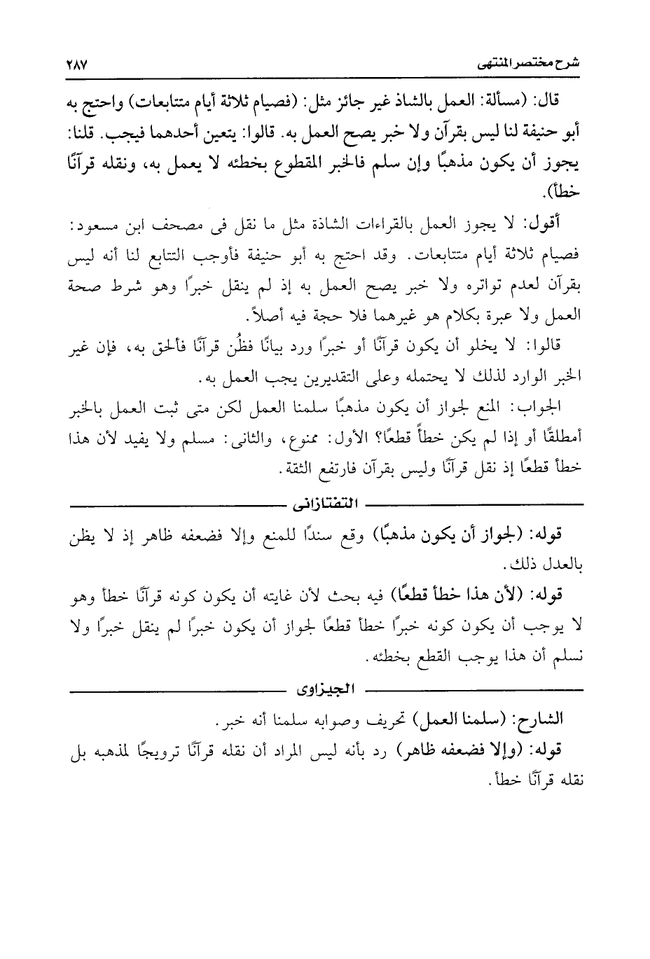 أقول: لا يجوز العمل بالقراءات الشاذة مثل ما نقل فى مصحف ابن مسعود: فصيام ثلاثة أيام متتابعات. وقد احتج به أبو حنيفة فأوجب التتابع لنا أنه ليس بقرآن لعدم تواتره ولا خبر يصح العمل به إذ لم ينقل خبرًا وهو شرط صحة العمل ولا عبرة بكلام هو غيرهما فلا حجة فيه أصلًا.