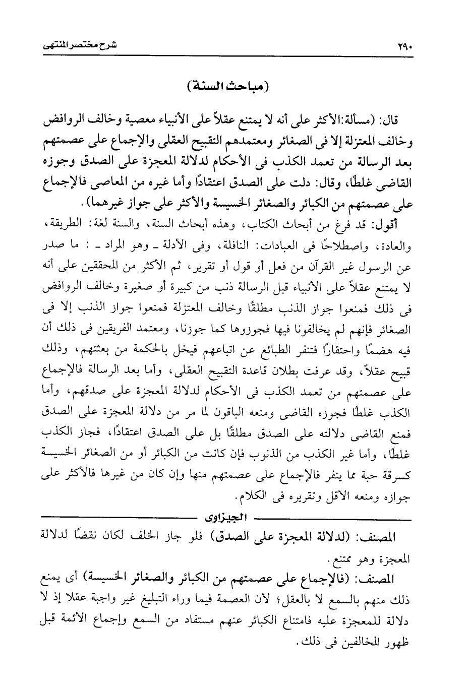 أقول: قد فرغ من أبحاث الكتاب، وهذه أبحاث السنة، والسنة لغة: الطريقة، والعادة، واصطلاحًا فى العبادات: النافلة، وفى الأدلة -وهو المراد-: ما صدر عن الرسول غير القرآن من فعل أو قول أو تقرير، ثم الأكثر من المحققين على أنه لا يمتنع عقلًا على الأنبياء قبل الرسالة ذنب من كبيرة أو صغيرة وخالف الروافض فى ذلك فمنعوا جواز الذنب مطلقًا وخالف المعتزلة فمنعوا جواز الذنب إلا فى الصغائر فإنهم لم يخالفونا فيها فجوزوها كما جوزنا، ومعتمد الفريقين فى ذلك أن فيه هضمًا واحتقارًا فتنفر الطبائع عن اتباعهم فيخل بالحكمة من بعثتهم، وذلك قبيح عقلًا، وقد عرفت بطلان قاعدة التقبيح العقلى، وأما بعد الرسالة فالإجماع على عصمتهم من تعمد الكذب فى الأحكام لدلالة المعجزة على صدقهم، وأما الكذب غلطًا فجوزه القاضى ومنعه الباقون لما مر من دلالة المعجزة على الصدق فمنع القاضى دلالته على الصدق مطلقًا بل على الصدق اعتقادًا، فجاز الكذب غلطًا، وأما غير الكذب من الذنوب فإن كانت من الكبائر أو من الصغائر الخسيسة كسرقة حبة مما ينفر فالإجماع على عصمتهم منها وإن كان من غيرها فالأكثر على جوازه ومنعه الأقل وتقريره فى الكلام.