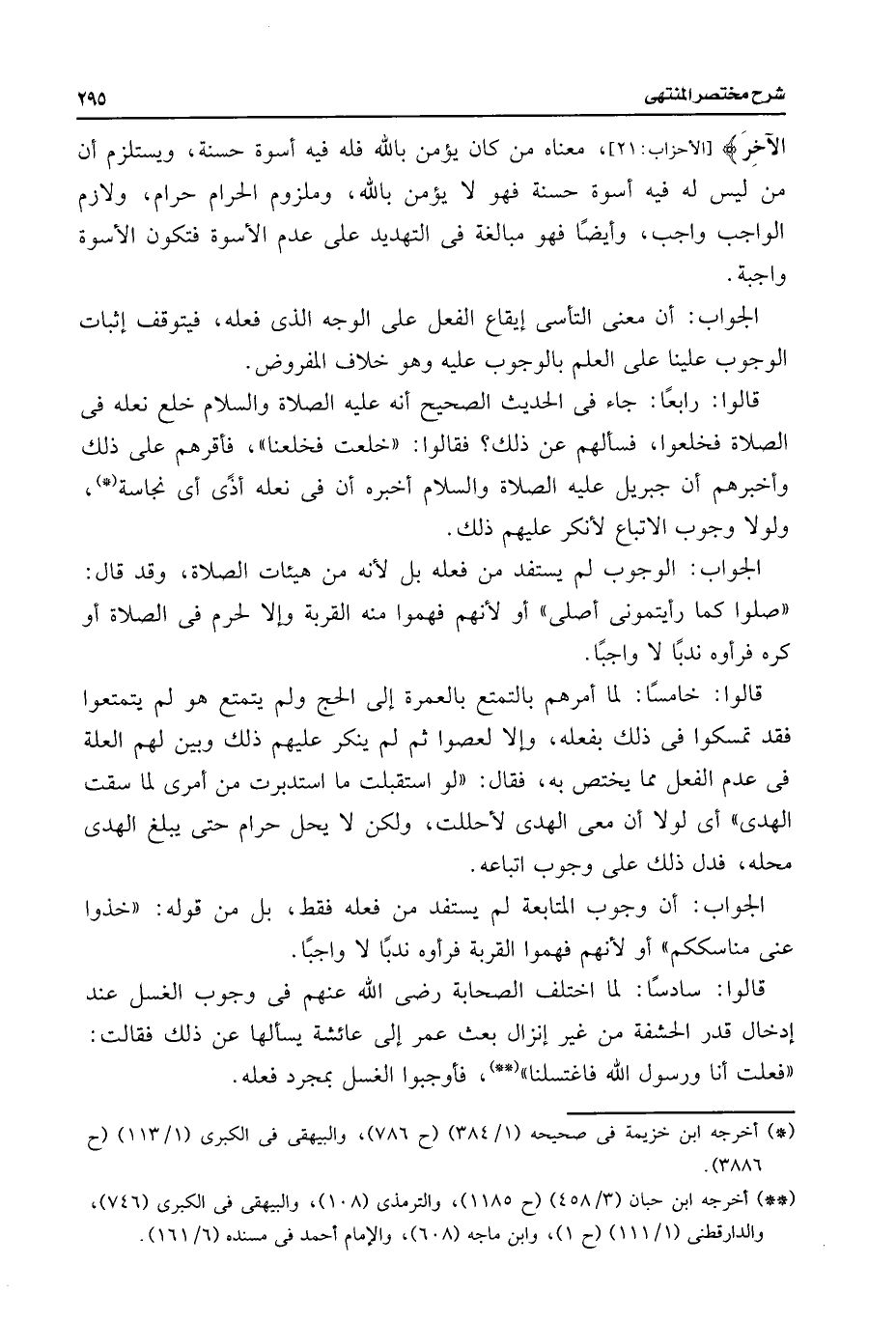 قالوا: رابعًا: جاء فى الحديث الصحيح أنه عليه الصلاة والسلام خلع نعله فى الصلاة فخلعوا، فسألهم عن ذلك؟ فقالوا: "خلعت فخلعنا"، فأقرهم على ذلك وأخبرهم أن جبريل عليه الصلاة والسلام أخبره أن فى نعله أذًى أى نجاسة (*)، ولولا وجوب الاتباع لأنكر عليهم ذلك.