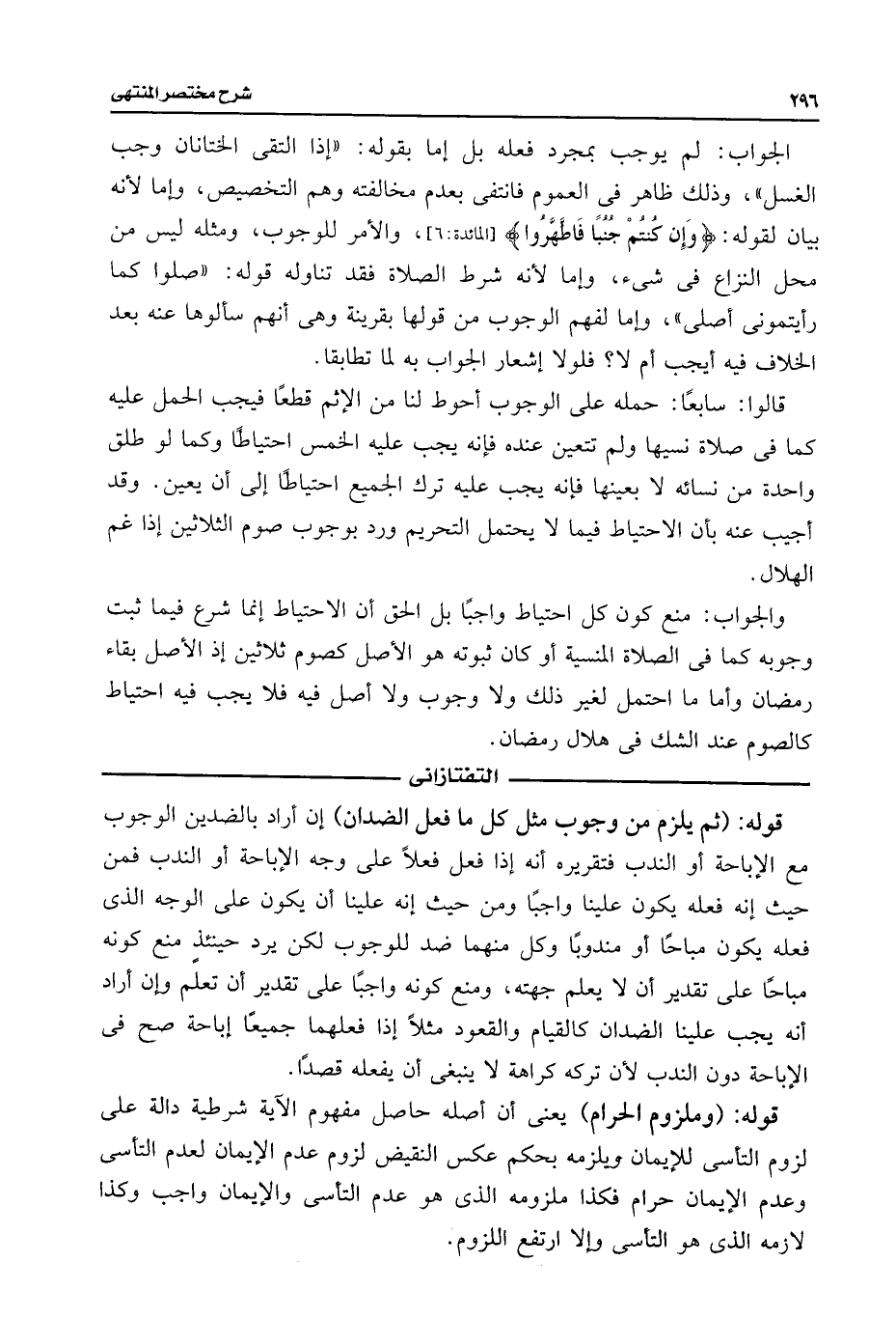 قالوا: سابعًا: حمله على الوجوب أحوط لنا من الإثم قطعًا فيجب الحمل عليه كما فى صلاة نسيها ولم تتعين عنده فإنه يجب عليه الخمس احتياطًا وكما لو طلق واحدة من نسائه لا بعينها فإنه يجب عليه ترك الجميع احتياطًا إلى أن يعين. وقد أجيب عنه بأن الاحتياط فيما لا يحتمل التحريم ورد بوجوب صوم الثلاثين إذا غم الهلال.