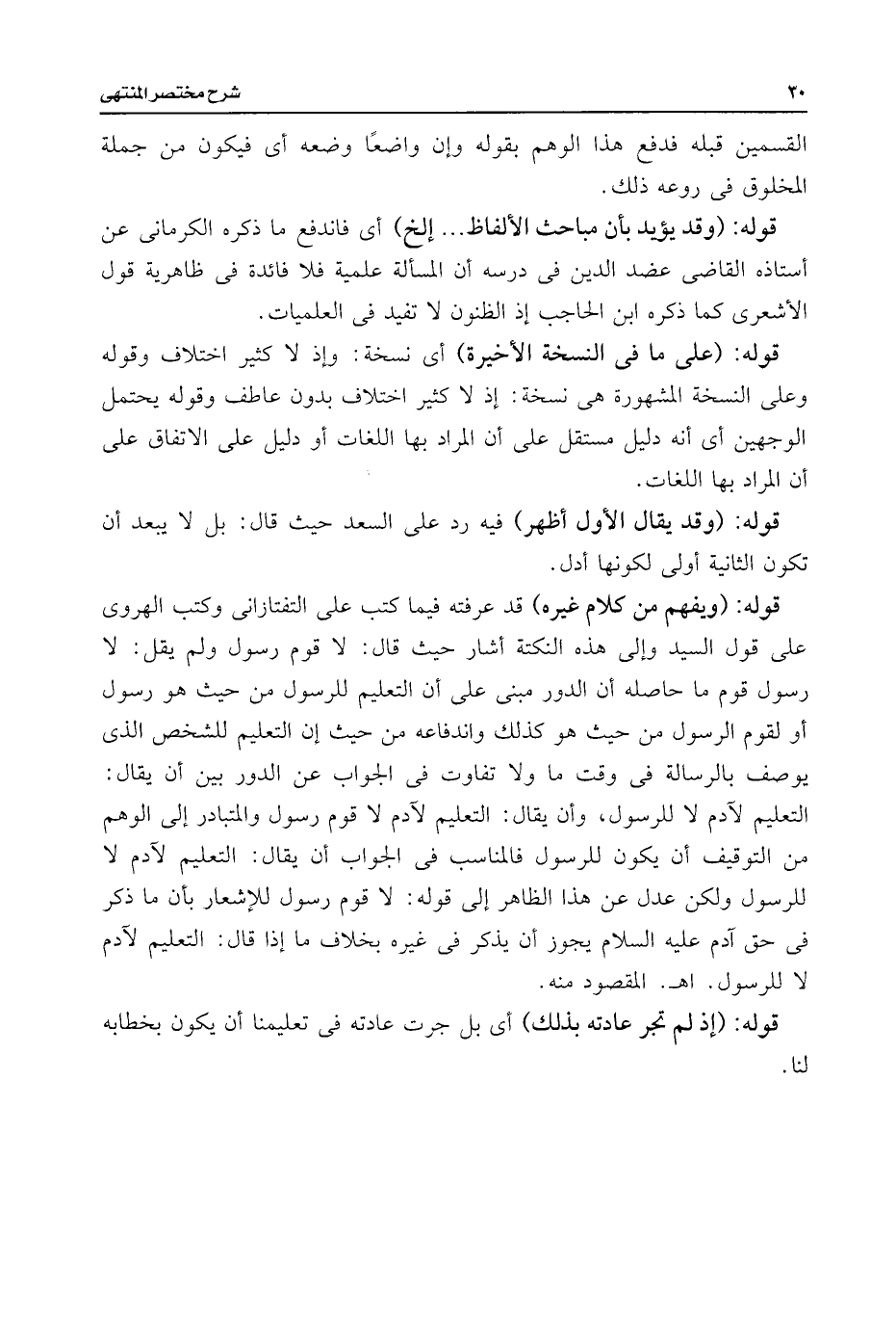 قوله: (ويفهم من كلام غيره) قد عرفته فيما كتب على التفتازانى وكتب الهروى على قول السيد وإلى هذه النكتة أشار حيث قال: لا قوم رسول ولم يقل: لا رسول قوم ما حاصله أن الدور مبنى على أن التعليم للرسول من حيث هو رسول أو لقوم الرسول من حيث هو كذلك واندفاعه من حيث إن التعليم للشخص الذى يوصف بالرسالة فى وقت ما ولا تفاوت فى الجواب عن الدور بين أن يقال: التعليم لآدم لا للرسول، وأن يقال: التعليم لآدم لا قوم رسول والمتبادر إلى الوهم من التوقيف أن يكون للرسول فالمناسب فى الجواب أن يقال: التعليم لآدم لا للرسول ولكن عدل عن هذا الظاهر إلى قوله: لا قوم رسول للإشعار بأن ما ذكر فى حق آدم عليه السلام يجوز أن يذكر فى غيره بخلاف ما إذا قال: التعليم لآدم لا للرسول. اهـ. المقصود منه.