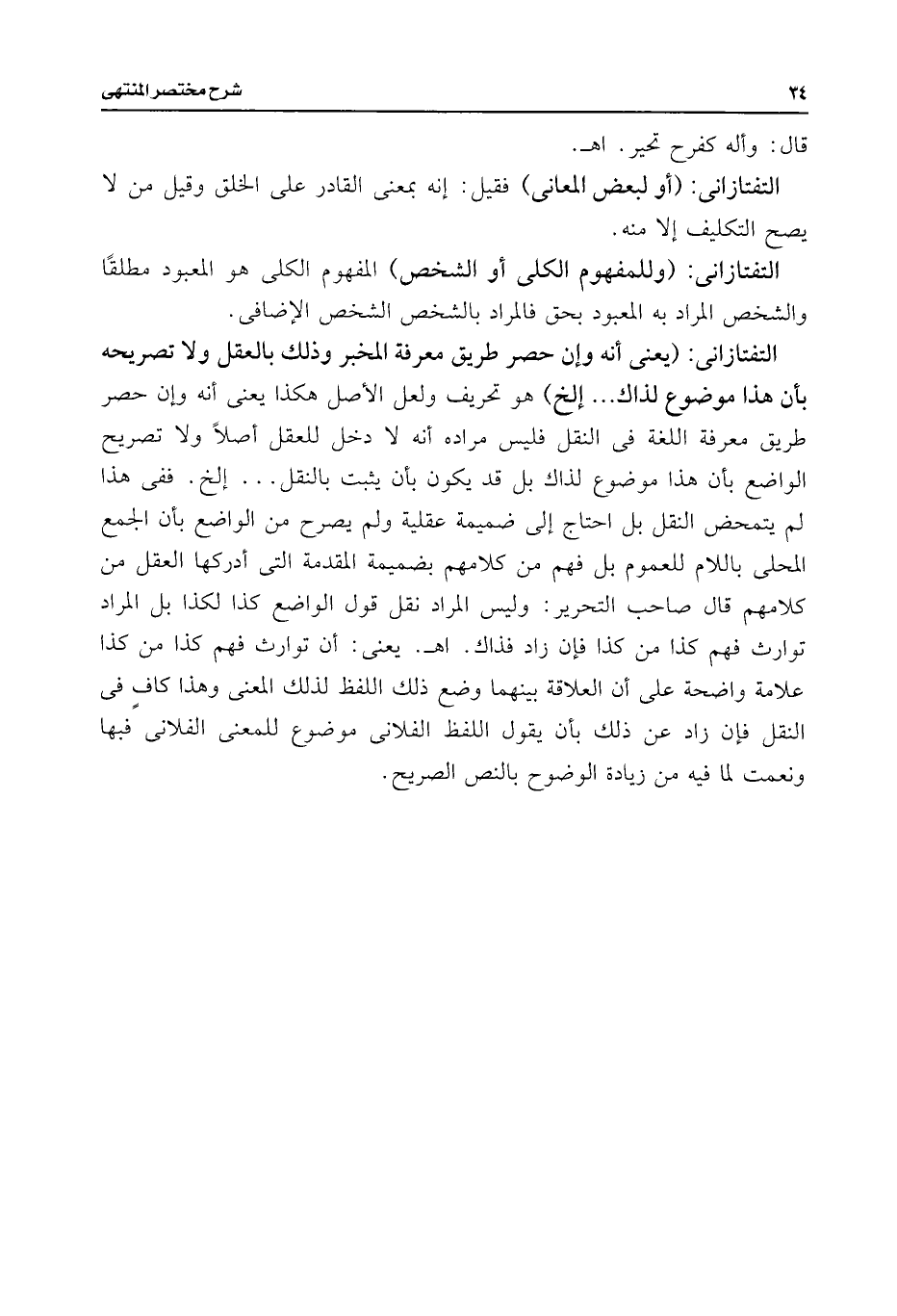 التنفتازانى: (يعنى أنه كان حصر طريق معرفة الخبر وذلك بالعقل ولا تصريحه بأن هذا موضوع لذاك. . . إلخ) هو تحريف ولعل الأصل هكذا يعنى أنه وإن حصر طريق معرفة اللغة فى النقل فليس مراده أنه لا دخل للعقل أصلًا ولا تصريح الواضع بأن هذا موضوع لذاك بل قد يكون بأن يثبت بالنقل. . . إلخ. ففى هذا لم يتمحض النقل بل احتاج إلى ضميمة عقلية ولم يصرح من الواضع بأن الجمع المحلى باللام للعموم بل فهم من كلامهم بضميمة المقدمة التى أدركها العقل من كلامهم قال صاحب التحرير: وليس المراد نقل قول الواضع كذا لكذا بل المراد توارث فهم كذا من كذا فإن زاد فذاك. اهـ. يعنى: أن توارث فهم كذا من كذا علامة واضحة على أن العلاقة بينهما وضع ذلك اللفظ لذلك المعنى وهذا كافٍ فى النقل فإن زاد عن ذلك بأن يقول اللفظ الفلانى موضوع للمعنى الفلانى فبها ونعمت لما فيه من زيادة الوضوح بالنص الصريح.