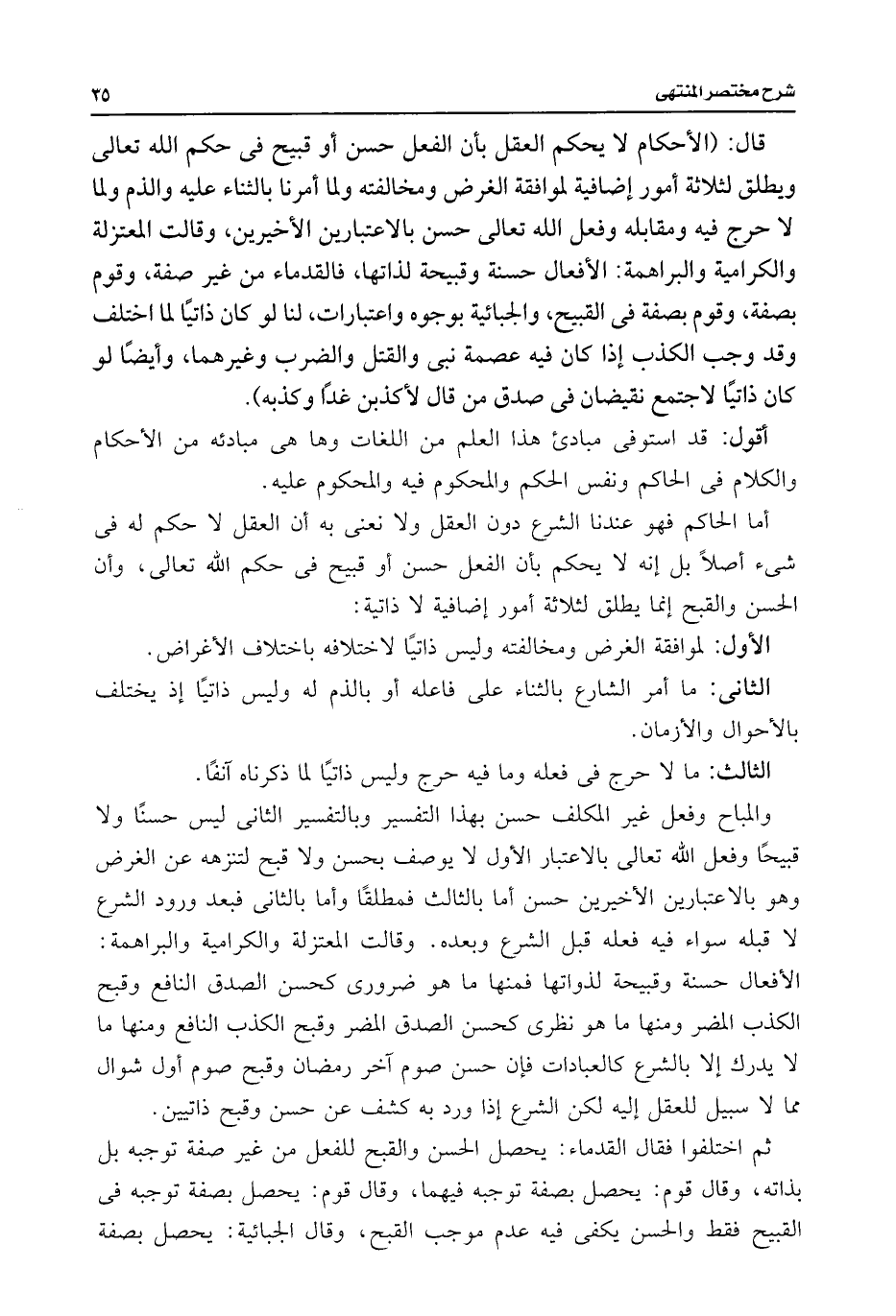 قال: (الأحكام لا يحكم العقل بأن الفعل حسن أو قبيح فى حكم اللَّه تعالى ويطلق لثلاثة أمور إضافية لموافقة الغرض ومخالفته ولا أمرنا بالثناء عليه والذم ولما لا حرج فيه ومقابله وفعل اللَّه تعالى حسن بالاعتبارين الأخيرين، وقالت المعتزلة والكرامية والبراهمة: الأفعال حسنة وقبيحة لذاتها، فالقدماء من غير صفة، وقوم بصفة، وقوم بصفة فى القبيح، والجبائية بوجوه واعتبارات، لنا لو كان ذاتيًا لما اختلف وقد وجب الكذب إذا كان فيه عصمة نبى والقتل والضرب وغيرهما، وأيضًا لو كان ذاتيًا لاجتمع نقيضان فى صدق من قال لأكذبن غدًا وكذبه).
