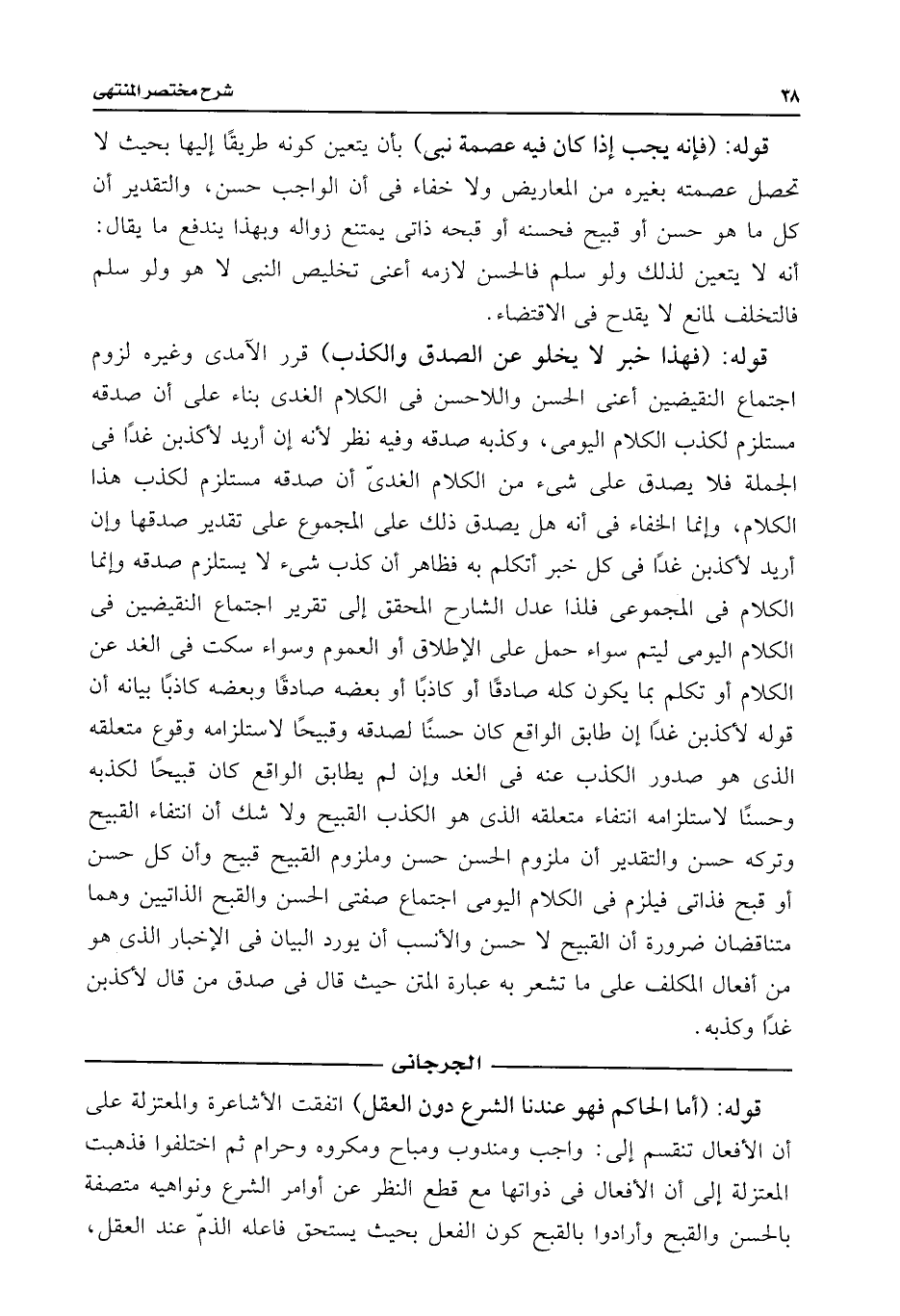 قوله: (فإنه يجب إذا كان فيه عصمة نبى) بأن يتعين كونه طريقًا إليها بحيث لا تحصل عصمته بغيره من المعاريض ولا خفاء فى أن الواجب حسن، والتقدير أن كل ما هو حسن أو قبيح فحسنه أو قبحه ذاتى يمتنع زواله وبهذا يندفع ما يقال: أنه لا يتعين لذلك ولو سلم فالحسن لازمه أعنى تخليص النبى لا هو ولو سلم فالتخلق لمانع لا يقدح فى الاقضاء.