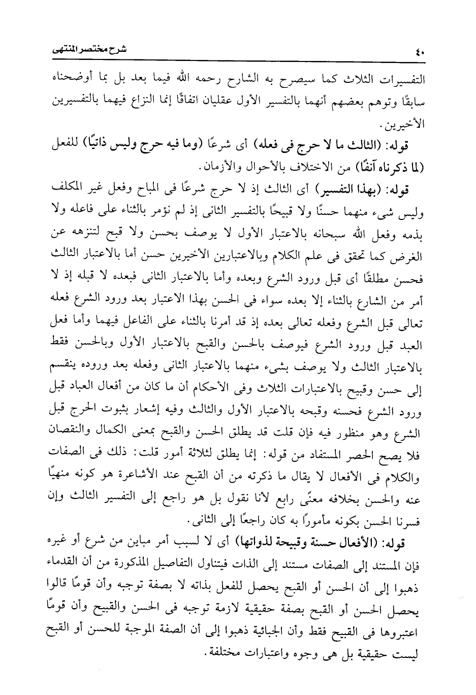 قوله: (بهذا التفسير) أى الثالث إذ لا حرج شرعًا فى المباح وفعل غير المكلف وليس شئ منهما حسنًا ولا قبيحًا بالتفسير الثانى إذ لم نؤمر بالثناء على فاعله ولا بذمه وفعل اللَّه سبحانه بالاعتبار الأول لا يوصف بحسن ولا قبح لتنزهه عن الغرض كما تحقق فى علم الكلام وبالاعتبارين الأخيرين حسن أما بالاعتبار الثالث فحسن مطلقًا أى قبل ورود الشرع وبعده وأما بالاعتبار الثانى فبعده لا قبله إذ لا أمر من الشارع بالثناء إلا بعده سواء فى الحسن بهذا الاعتبار بعد ورود الشرع فعله تعالى قبل الشرع وفعله تعالى بعده إذ قد أمرنا بالثناء على الفاعل فيهما وأما فعل العبد قبل ورود الشرع فيوصف بالحسن والقبح بالاعتبار الأول وبالحسن فقط بالاعتبار الثالث ولا يوصف بشئ منهما بالاعتبار الثانى وفعله بعد وروده ينقسم إلى حسن وقبيح بالاعتبارات الثلاث وفى الأحكام أن ما كان من أفعال العباد قبل ورود الشرع فحسنه وقبحه بالاعتبار الأول والثالث وفيه إشعار بثبوت الحرج قبل الشرع وهو منظور فيه فإن قلت قد يطلق الحسن والقبح بمعنى الكمال والنقصان فلا يصح الحصر المستفاد من قوله: إنما يطلق لثلاثة أمور قلت: ذلك فى الصفات والكلام فى الأفعال لا يقال ما ذكرته من أن القبح عند الأشاعرة هو كونه منهيًا عنه والحسن بخلافه معنًى رابع لأنا نقول بل هو راجع إلى التفسير الثالث وإن فسرنا الحسن بكونه مأمورًا به كان راجعًا إلى الثانى.