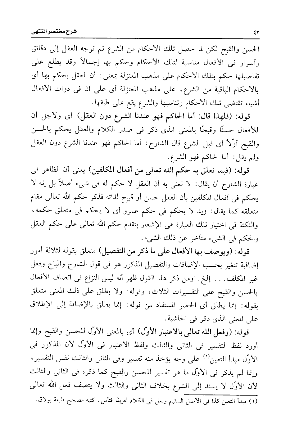الحسن والقبح لكن لما حصل تلك الأحكام من الشرع ثم توجه العقل إلى دقائق وأسرار فى الأفعال مناسبة لتلك الأحكام وحكم بها إجمالًا وقد يطلع على تفاصيلها حكم بتلك الأحكام على مذهب المعتزلة بمعنى: أن العقل يحكم بها أى بالأحكام الباقية من الشرع، على مذهب المعتزلة أى على أن فى ذوات الأفعال أشياء تقتضى تلك الأحكام وتناسبها والشرع يقع على طبقها.