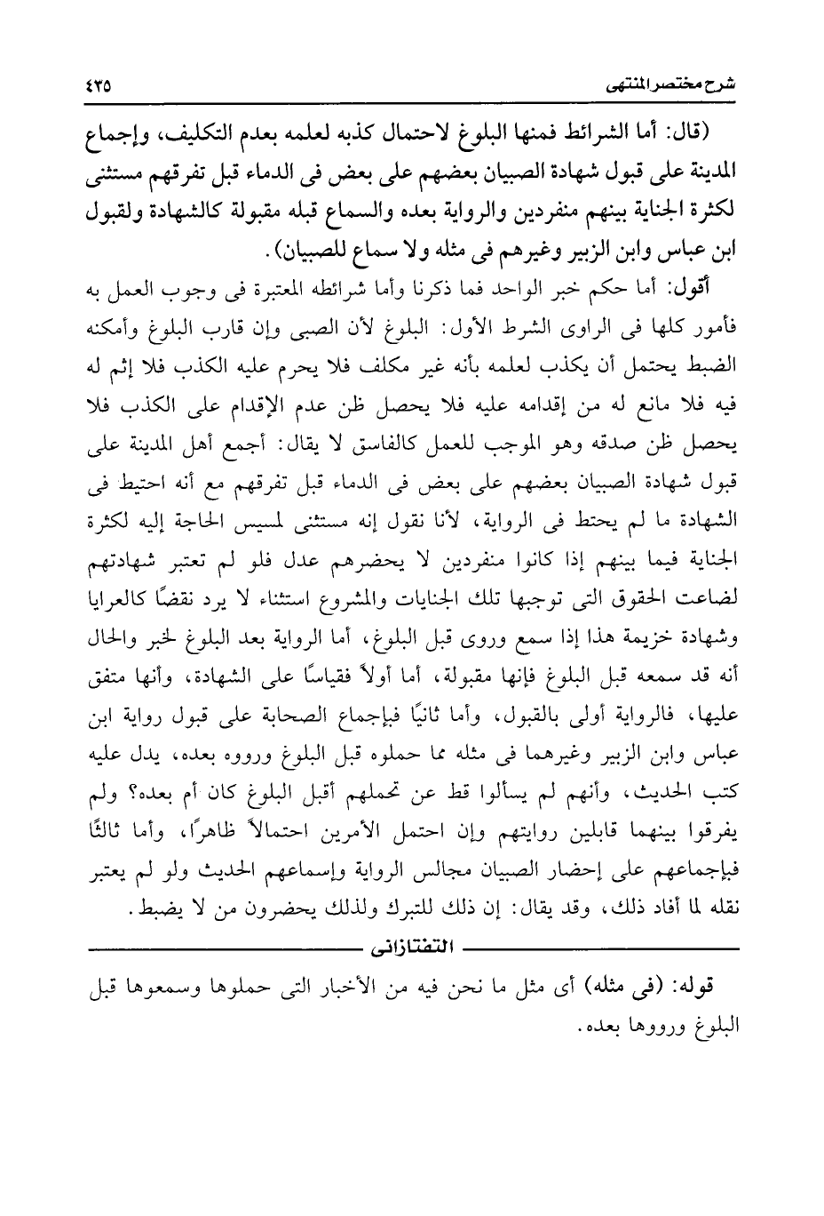 أقول: أما حكم خبر الواحد فما ذكرنا وأما شرائطه المعتبرة فى وجوب العمل به فأمور كلها فى الراوى الشرط الأول: البلوغ لأن الصبى وإن قارب البلوغ وأمكنه الضبط يحتمل أن يكذب لعلمه بأنه غير مكلف فلا يحرم عليه الكذب فلا إثم له فيه فلا مانع له من إقدامه عليه فلا يحصل ظن عدم الإقدام على الكذب فلا يحصل ظن صدقه وهو الموجب للعمل كالفاسق لا يقال: أجمع أهل المدينة على قبول شهادة الصبيان بعضهم على بعض فى الدماء قبل تفرقهم مع أنه احتيط فى الشهادة ما لم يحتط فى الرواية، لأنا نقول إنه مستثنى لمسيس الحاجة إليه لكثرة الجناية فيما بينهم إذا كانوا منفردين لا يحضرهم عدل فلو لم تعتبر شهادتهم لضاعت الحقوق التى توجبها تلك الجنايات والمشروع استثناء لا يرد نقضًا كالعرايا وشهادة خزيمة هذا إذا سمع وروى قبل البلوغ، أما الرواية بعد البلوغ لخبر والحال أنه قد سمعه قبل البلوغ فإنها مقبولة، أما أولًا فقياسًا على الشهادة، وأنها متفق عليها، فالرواية أولى بالقبول، وأما ثانيًا فبإجماع الصحابة على قبول رواية ابن عباس وابن الزبير وغيرهما فى مثله مما حملوه قبل البلوغ ورووه بعده، يدل عليه كتب الحديث، وأنهم لم يسألوا قط عن تحملهم أقبل البلوغ كان أم بعده؟ ولم يفرقوا بينهما قابلين روايتهم وإن احتمل الأمرين احتمالًا ظاهرًا، وأما ثالثًا فبإجماعهم على إحضار الصبيان مجالس الرواية وإسماعهم الحديث ولو لم يعتبر نقله لما أفاد ذلك، وقد يقال: إن ذلك للتبرك ولذلك يحضرون من لا يضبط.