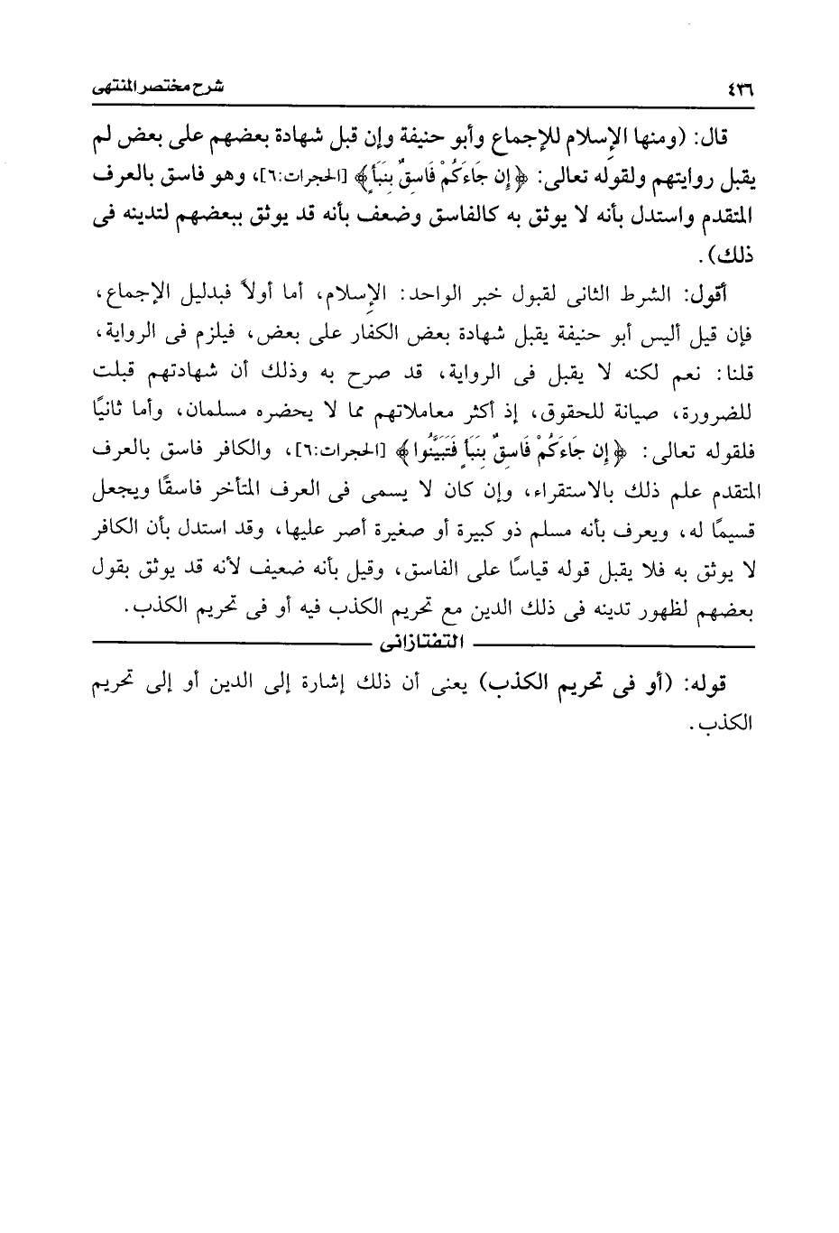 أقول: الشرط الثانى لقبول خبر الواحد: الإسلام، أما أولًا فبدليل الإجماع، فإن قيل أليس أبو حنيفة يقبل شهادة بعض الكفار على بعض، فيلزم فى الرواية، قلنا: نعم لكنه لا يقبل فى الرواية، قد صرح به وذلك أن شهادتهم قبلت للضرورة، صيانة للحقوق، إذ أكثر معاملاتهم مما لا يحضره مسلمان، وأما ثانيًا فلقوله تعالى: {إِنْ جَاءَكُمْ فَاسِقٌ بِنَبَإٍ فَتَبَيَّنُوا} [الحجرات: ٦]، والكافر فاسق بالعرف المتقدم علم ذلك بالاستقراء، وإن كان لا يسمى فى العرف المتأخر فاسقًا ويجعل قسيمًا له، ويعرف بأنه مسلم ذو كبيرة أو صغيرة أصر عليها، وقد استدل بأن الكافر لا يوثق به فلا يقبل قوله قياسًا على الفاسق، وقيل بأنه ضعيف لأنه قد يوثق بقول بعضهم لظهور تدينه فى ذلك الدين مع تحريم الكذب فيه أو فى تحريم الكذب.