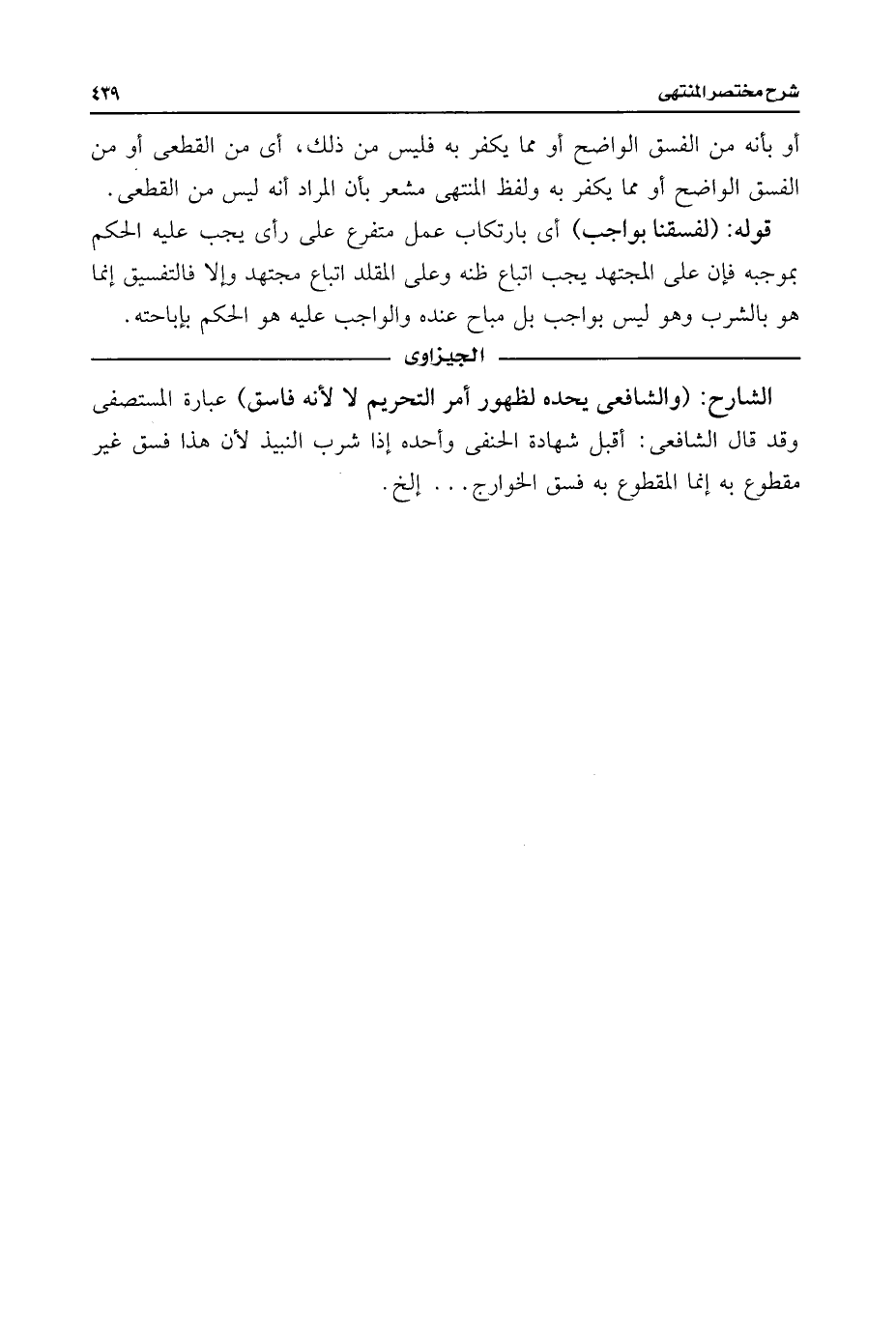 أو بأنه من الفسق الواضح أو مما يكفر به فليس من ذلك، أى من القطعى أو من الفسق الواضح أو مما يكفر به ولفظ المنتهى مشعر بأن المراد أنه ليس من القطعى.