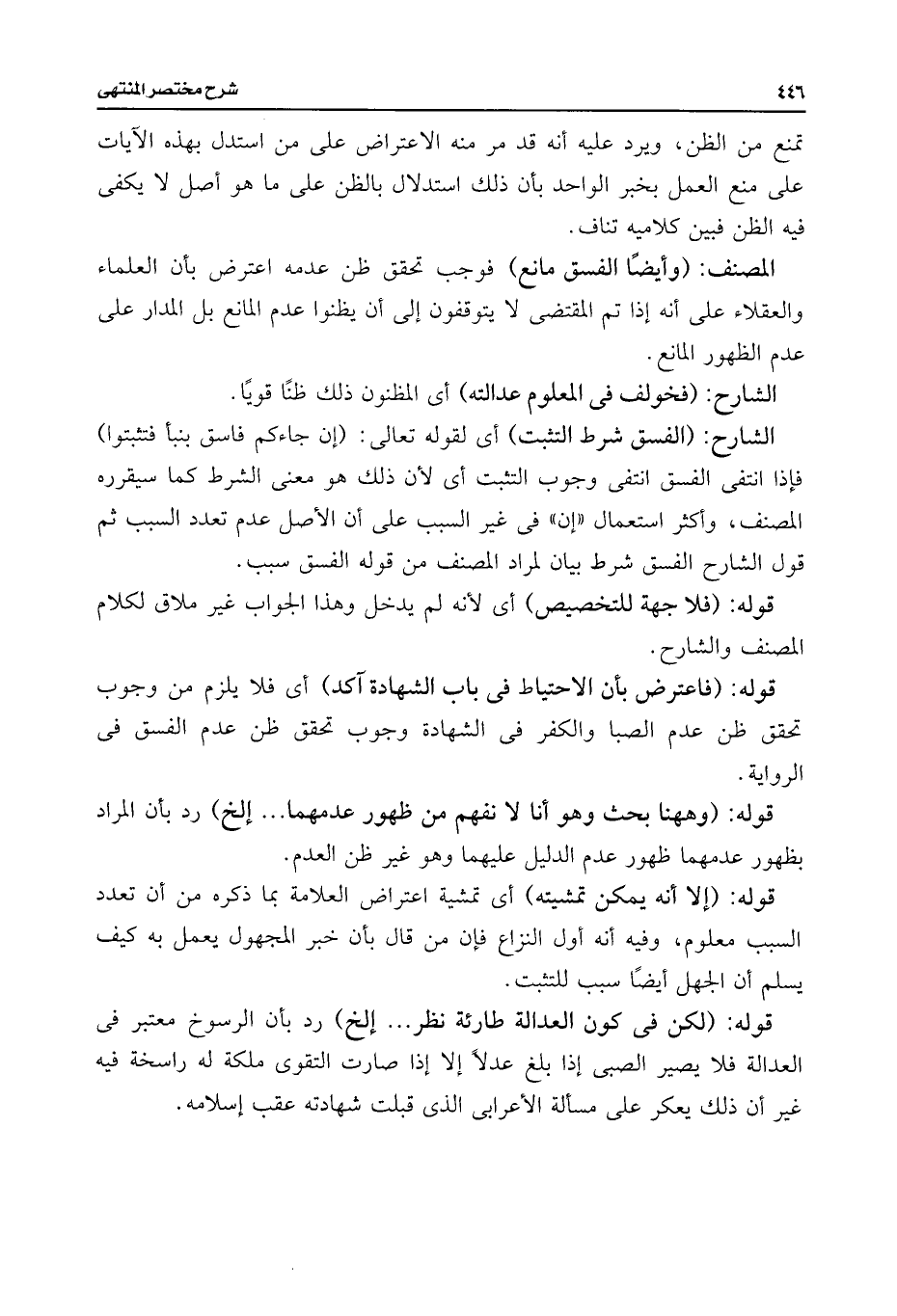 الشارح: (الفسق شرط التثبت) أى لقوله تعالى: (إن جاءكم فاسق بنبأ فتثبتوا) فإذا انتفى الفسق انتفى وجوب التثبت أى لأن ذلك هو معنى الشرط كما سيقرره المصنف، وأكثر استعمال "إن" فى غير السبب على أن الأصل عدم تعدد السبب ثم قول الشارح الفسق شرط بيان لمراد المصنف من قوله الفسق سبب.