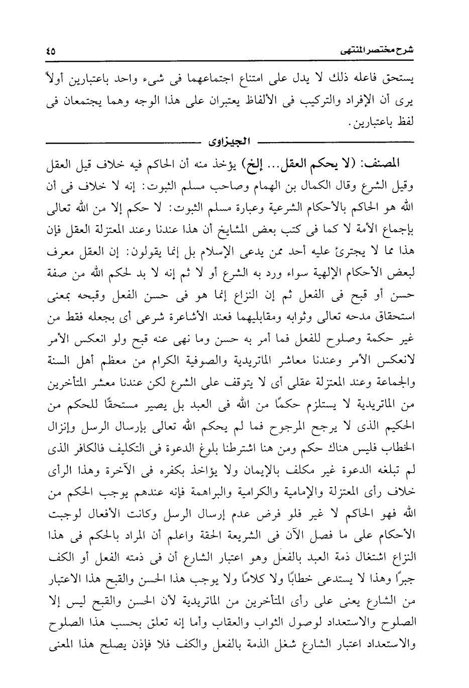 المصنف: (لا يحكم العقل. . . إلخ) يؤخذ منه أن الحاكم فيه خلف قيل العقل وقيل الشرع وقال الكمال بن الهمام وصاحب مسلم الثبوت: إنه لا خلاف فى أن اللَّه هو الحاكم بالأحكام الشرعية وعبارة مسلم الثبوت: لا حكم إلا من اللَّه تعالى بإجماع الأمة لا كما فى كتب بعض المشايخ أن هذا عندنا وعند المعتزلة العقل فإن هذا مما لا يجترئ عليه أحد ممن يدعى الإسلام بل إنما يقولون: إن العقل معرف لبعض الأحكام الإلهية سواء ورد به الشرع أو لا ثم إنه لا بد لحكم اللَّه من صفة حسن أو قبح فى الفعل ثم إن النزاع إنما هو فى حسن الفعل وقبحه بمعنى استحقاق مدحه تعالى وثوابه ومقابليهما فعند الأشاعرة شرعى أى بجعله فقط من غير حكمة وصلوح للفعل فما أمر به حسن وما نهى عنه قبح ولو انعكس الأمر لانعكس الأمر وعندنا معاشر الماتريدية والصوفية الكرام مات معظم أهل السنة والجماعة وعند المعتزلة عقلى أى لا يتوقف على الشرع لكن عندنا معشر المتأخرين من الماتريدية لا يستلزم حكمًا من اللَّه فى العبد بل يصير مستحقًا للحكم من الحكيم الذى لا يرجح المرجوح فما لم يحكم اللَّه تعالى بإرسال الرسل وإنزال الخطاب فليس هناك حكم ومات هنا اشترطنا بلوغ الدعوة فى التكليف فالكافر الذى لم تبلغه الدعوة غير مكلف بالإيمان ولا يؤاخذ بكفره فى الآخرة وهذا الرأى خلف رأى المعتزلة والإمامية والكرامية والبراهمة فإنه عندهم يوجب الحكم من اللَّه فهو الحاكم لا غير فلو فرض عدم إرسال الرسل وكانت الأفعال لوجبت الأحكام على ما فصل الآن فى الشريعة الحقة واعلم أن المراد بالحكم فى هذا النزاع اشتغال ذمة العبد بالفعل وهو اعتبار الشارع أن فى ذمته الفعل أو الكف جبرًا وهذا لا يستدعى خطابًا ولا كلامًا ولا يوجب هذا الحسن والقبح هذا الاعتبار من الشارع يعنى على رأى المتأخرين من الماتريدية لأن الحسن والقبح ليس إلا الصلوح والاستعداد لوصول الثواب والعقاب وأما إنه تعلق بحسب هذا الصلوح والاستعداد اعتبار الشارع شغل الذمة بالفعل والكف فلا فإذن يصلح هذا المعنى