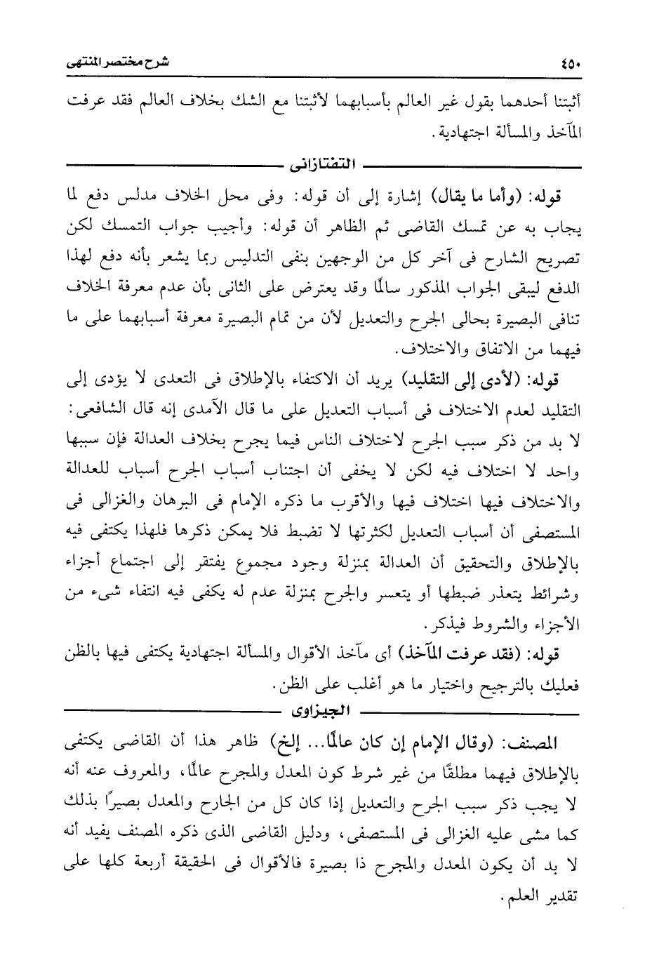قوله: (لأدى إلى التقليد) يريد أن الاكتفاء بالإطلاق فى التعدى لا يؤدى إلى التقليد لعدم الاختلاف فى أسباب التعديل على ما قال الآمدى إنه قال الشافعى: لا بد من ذكر سبب الجرح لاختلاف الناس فيما يجرح بخلاف العدالة فإن سببها واحد لا اختلاف فيه لكن لا يخفى أن اجتناب أسباب الجرح أسباب للعدالة والاختلاف فيها اختلاف فيها والأقرب ما ذكره الإمام فى البرهان والغزالى فى المستصفى أن أسباب التعديل لكثرتها لا تضبط فلا يمكن ذكرها فلهذا يكتفى فيه بالإطلاق والتحقيق أن العدالة بمنزلة وجود مجموع يفتقر إلى اجتماع أجزاء وشرائط يتعذر ضبطها أو يتعسر والجرح بمنزلة عدم له يكفى فيه انتفاء شئ من الأجزاء والشروط فيذكر.