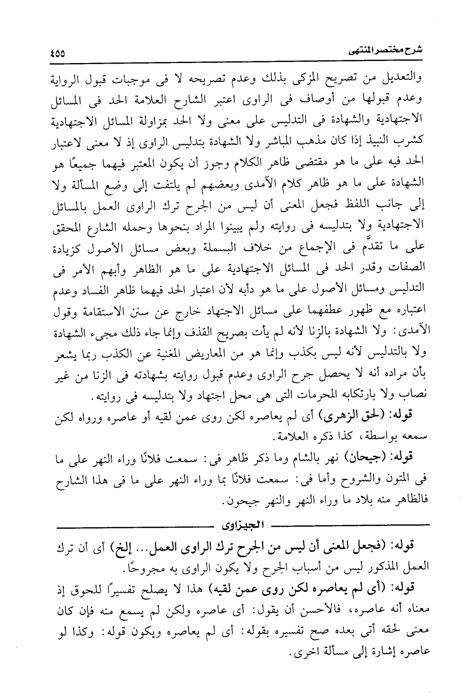 والتعديل من تصريح المزكى بذلك وعدم تصريحه لا فى موجبات قبول الرواية وعدم قبولها من أوصاف فى الراوى اعتبر الشارح العلامة الحد فى المسائل الاجتهادية والشهادة فى التدليس على معنى ولا الحد بمزاولة المسائل الاجتهادية كشرب النبيذ إذا كان مذهب المباشر ولا الشهادة بتدليس الراوى إذ لا معنى لاعتبار الحد فيه على ما هو مقتضى ظاهر الكلام وجوز أن يكون المعتبر فيهما جميعًا هو الشهادة على ما هو ظاهر كلام الآمدى وبعضهم لم يلتفت إلى وضع المسألة ولا إلى جانب اللفظ فجعل المعنى أن ليس من الجرح ترك الراوى العمل بالمسائل الاجتهادية ولا بتدليسه فى روايته ولم يبينوا المراد بنحوها وحمله الشارع المحقق على ما تقدَّم فى الإجماع من خلاف البسملة وبعض مسائل الأصول كزيادة الصفات وقدر الحد فى المسائل الاجتهادية على ما هو الظاهر وأبهم الأمر فى التدليس ومسائل الأصول على ما هو دأبه لأن اعتبار الحد فيهما ظاهر الفساد وعدم اعتباره مع ظهور عطفهما على مسائل الاجتهاد خارج عن من الاستقامة وقول الآمدى: ولا الشهادة بالزنا لأنه لم يأت بصريح القذف وإنما جاء ذلك مجئ الشهادة ولا بالتدليس لأنه ليس بكذب وإنما هو من المعاريض المغنية عن الكذب ربما يشعر بأن مراده أنه لا يحصل جرح الراوى وعدم قبول روايته بشهادته فى الزنا من غير نصاب ولا بارتكابه المحرمات التى هى محل اجتهاد ولا بتدليسه فى روايته.