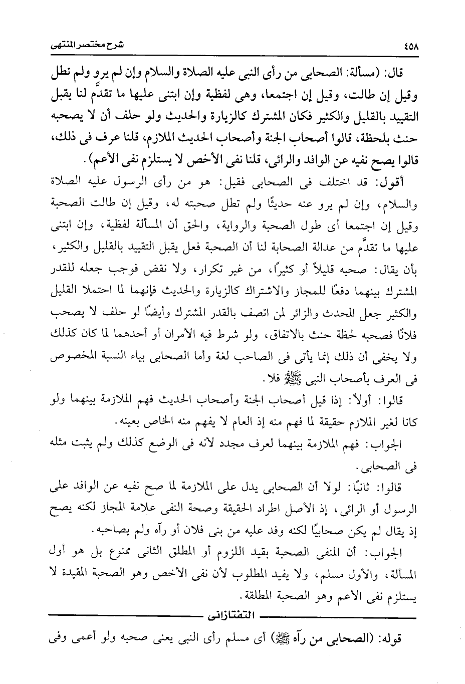قالوا: ثانيًا: لولا أن الصحابى يدل على الملازمة لما صح نفيه عن الوافد على الرسول أو الرائى، إذ الأصل اطراد الحقيقة وصحة النفى علامة المجاز لكنه يصح إذ يقال لم يكن صحابيًا لكنه وفد عليه من بنى فلان أو رآه ولم يصاحبه.