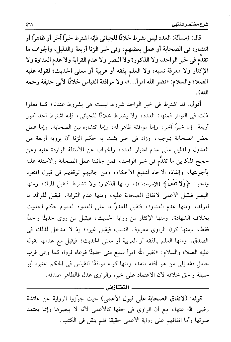 قال: (مسألة: العدد ليس بشرط خلافًا للجبائى فإنه اشترط خبرًا آخر أو ظاهرًا أو انتشاره فى الصحابة أو عمل بعضهم، وفى خبر الزنا أربعة والدليل، والجواب ما تقدَّم فى خبر الواحد، ولا الذكورة ولا البصر ولا عدم القرابة ولا عدم العداوة ولا الإكثار ولا معرفة نسبه، ولا العلم بفقه أو عربية أو معنى الحديث؛ لقوله عليه الصلاة والسلام: "نضر اللَّه امرأ. . . "، ولا موافقة القياس خلافًا لأبى حنيفة رحمه اللَّه).