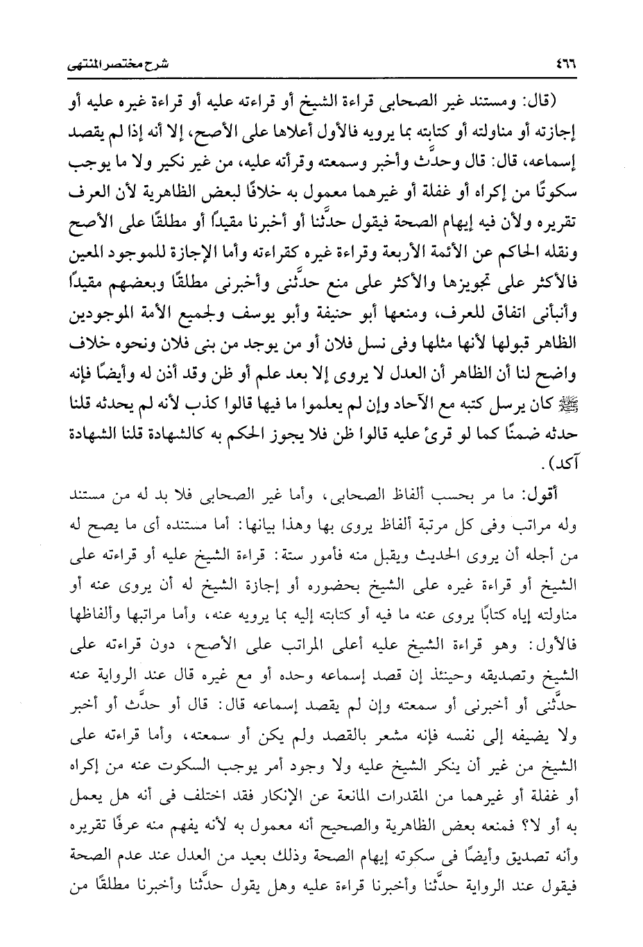 أقول: ما مر بحسب ألفاظ الصحابى، وأما غير الصحابى فلا بد له من مستند وله مراتب وفى كل مرتبة ألفاظ يروى بها وهذا بيانها: أما مستنده أى ما يصح له من أجله أن يروى الحديث ويقبل منه فأمور ستة: قراءة الشيخ عليه أو قراءته على الشيخ أو قراءة غيره على الشيخ بحضوره أو إجازة الشيخ له أن يروى عنه أو مناولته إياه كتابًا يروى عنه ما فيه أو كتابته إليه بما يرويه عنه، وأما مراتبها وألفاظها فالأول: وهو قراءة الشيخ عليه أعلى المراتب على الأصح، دون قراءته على الشيخ وتصديقه وحينئذ إن قصد إسماعه وحده أو مع غيره قال عند الرواية عنه حدَّثنى أو أخبرنى أو سمعته وإن لم يقصد إسماعه قال: قال أو حدَّث أو أخبر ولا يضيفه إلى نفسه فإنه مشعر بالقصد ولم يكن أو سمعته، وأما قراءته على الشيخ من غير أن ينكر الشيخ عليه ولا وجود أمر يوجب المسكوت عنه من إكراه أو غفلة أو غيرهما من القدرات المانعة عن الإنكار فقد اختلف فى أنه هل يعمل به أو لا؟ فمنعه بعض الظاهرية والصحيح أنه معمول به لأنه يفهم منه عرفًا تقريره وأنه تصديق وأيضًا فى سكوته إيهام الصحة وذلك بعيد من العدل عند عدم الصحة فيقول عند الرواية حدَّثنا وأخبرنا قراءة عليه وهل يقول حدَّثنا وأخبرنا مطلقًا من