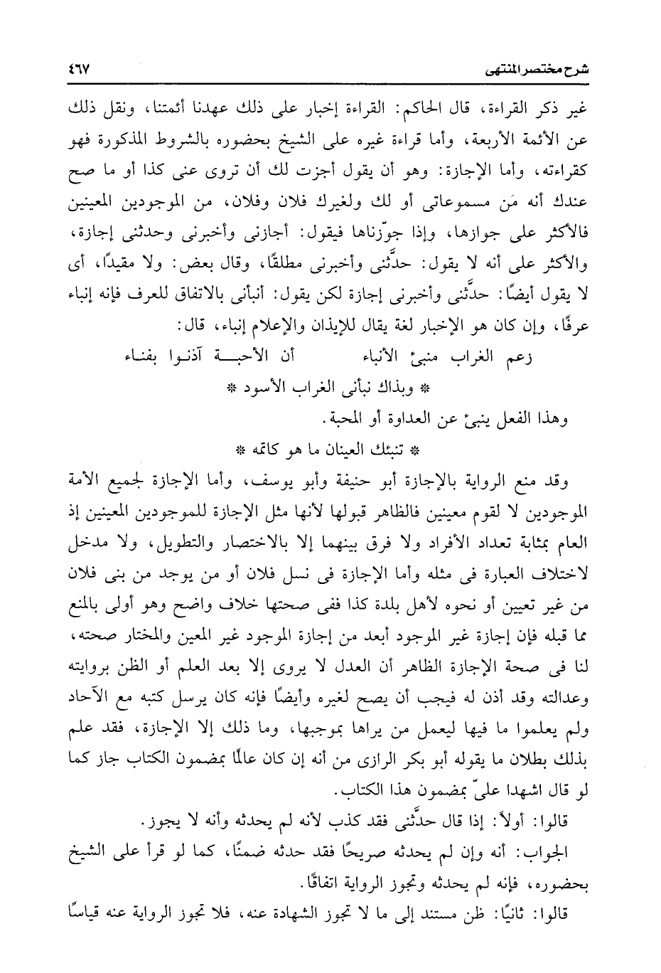 وقد منع الرواية بالإجازة أبو حنيفة وأبو يوسف، وأما الإجازة لجميع الأمة الموجودين لا لقوم معينين فالظاهر قبولها لأنها مثل الإجازة للموجودين المعينين إذ العام بمثابة تعداد الأفراد ولا فرق بينهما إلا بالاختصار والتطويل، ولا مدخل لاختلاف العبارة فى مثله وأما الإجازة فى نسل فلان أو من يوجد من بنى فلان من غير تعيين أو نحوه لأهل بلدة كذا ففى صحتها خلاف واضح وهو أولى بالمنع مما قبله فإن إجازة غير الموجود أبعد من إجازة الموجود غير المعين والمختار صحته، لنا فى صحة الإجازة الظاهر أن العدل لا يروى إلا بعد العلم أو الظن بروايته وعدالته وقد أذن له فيجب أن يصح لغيره وأيضًا فإنه كان يرسل كتبه مع الآحاد ولم يعلموا ما فيها ليعمل من يراها بموجبها، وما ذلك إلا الإجازة، فقد علم بذلك بطلان ما يقوله أبو بكر الرازى من أنه إن كان عالمًا بمضمون الكتاب جاز كما لو قال اشهدا علىّ بمضمون هذا الكتاب.
