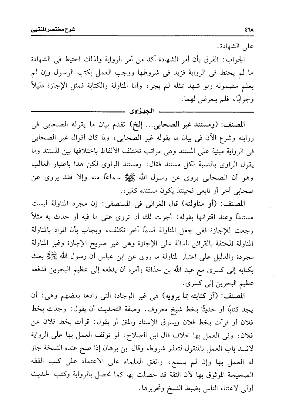 الجواب: الفرق بأن أمر الشهادة آكد من أمر الرواية ولذلك احتيط فى الشهادة ما لم يحتط فى الرواية فزيد فى شروطها ووجب العمل بكتب الرسول وإن لم يعلم مضمونه ولو شهد بمثله لم يجز، وأما المناولة والكتابة فمثل الإجازة دليلًا وجوابًا، فلم يتعرض لهما.