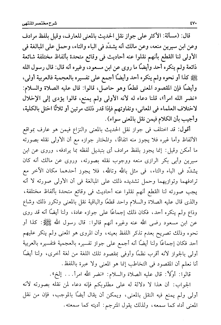 قال: (مسألة: الأكثر على جواز نقل الحديث بالمعنى للعارف، وقيل بلفظ مرادف وعن ابن سيرين منعه، وعن مالك أنه يشدّد فى الباء والتاء، وحمل على المبالغة فى الأولى لنا القطع بأنهم نقلوا عنه أحاديث فى وقائع متحدة بألفاظ مختلفة شائعة ذائعة ولم ينكره أحد وأيضًا ما روى عن ابن مسعود، وغيره أنه قال: قال رسول اللَّه -صلى اللَّه عليه وسلم- كذا أو نحوه ولم ينكره أحد وأيضًا أجمع على تفسيره بالعجمية فالعربية أولى، وأيضًا فإن المقصود المعنى قطعًا وهو حاصل، قالوا: قال عليه الصلاة والسلام: "نضر اللَّه امرأ"، قلنا دعاء له لأنه الأولى ولم يمنع، قالوا يؤدى إلى الإخلال لاختلاف العلماء فى المعانى، وتفاوتهم فإذا قدر ذلك مرتين أو ثلاثًا اختل بالكلية، وأجيب بأن الكلام فيمن نقل بالمعنى سواء).
