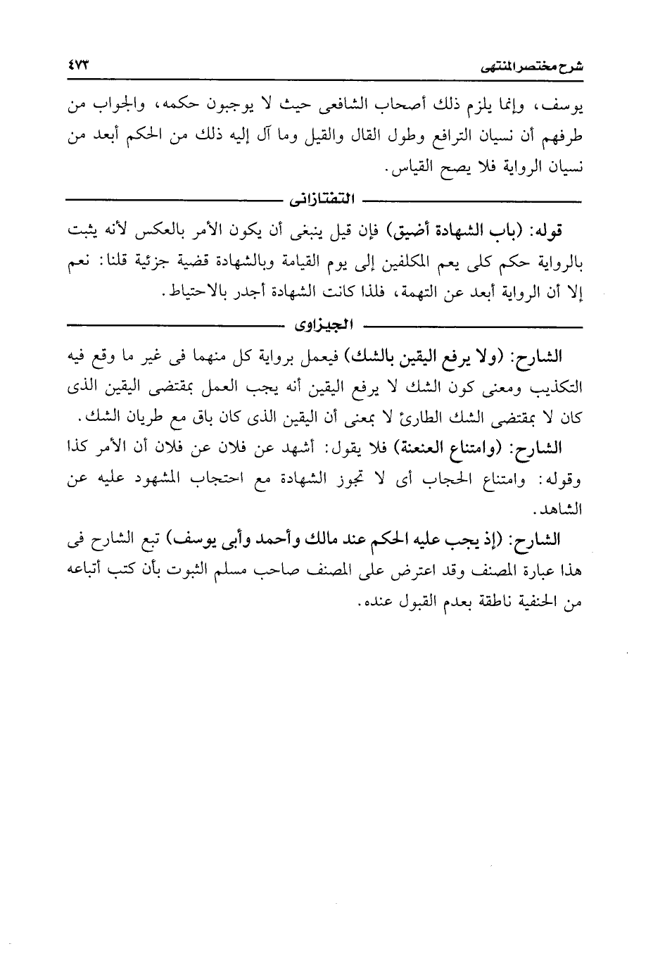 الشارح: (ولا يرفع اليقين بالشك) فيعمل برواية كل منهما فى غير ما وقع فيه التكذيب ومعنى كون الشك لا يرفع اليقين أنه يجب العمل بمقتضى اليقين الذى كان لا بمقتضى الشك الطارئ لا بمعنى أن اليقين الذى كان باق مع طريان الشك.