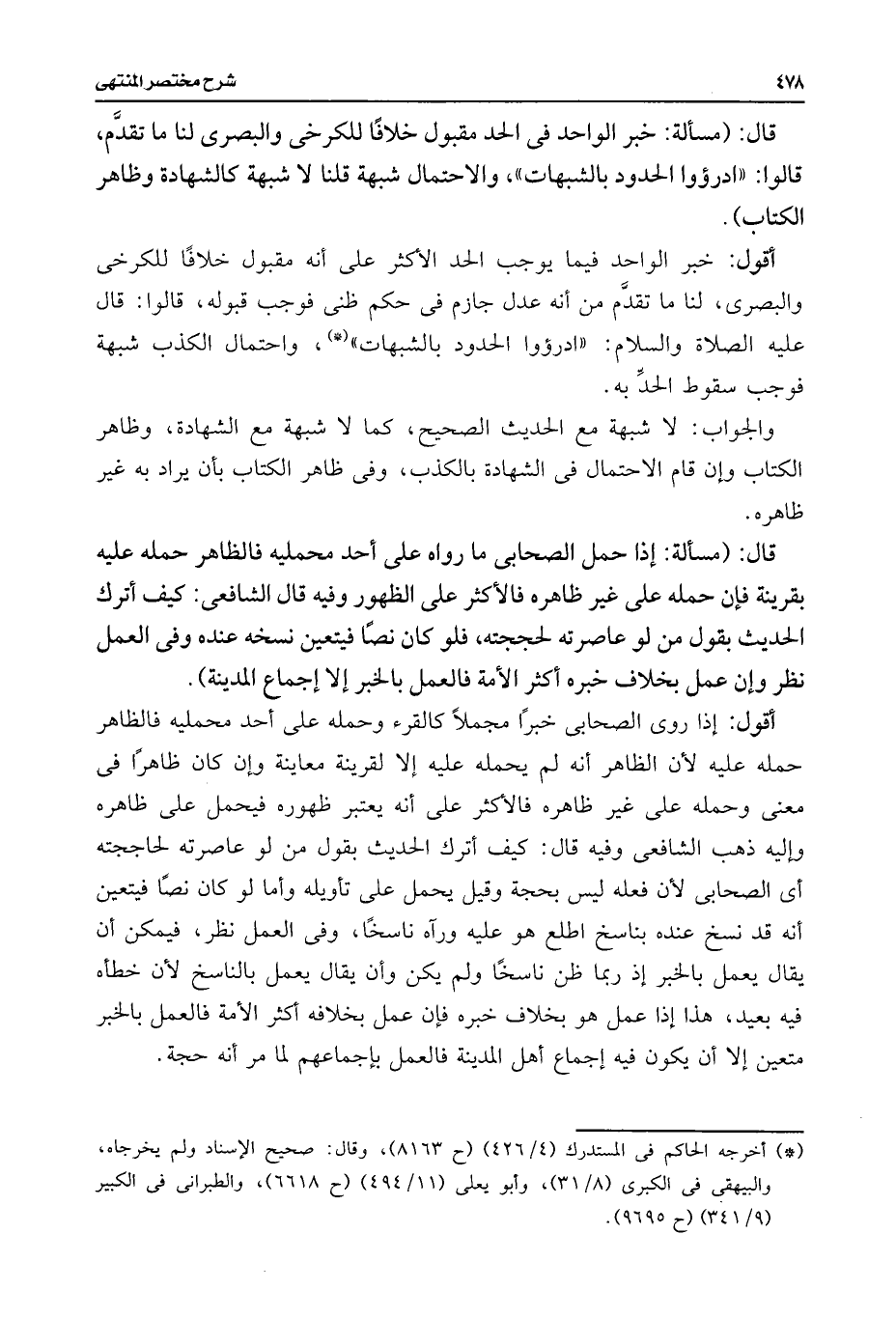 أقول: خبر الواحد فيما يوجب الحد الأكثر على أنه مقبول خلافًا للكرخى والبصرى، لنا ما تقدَّم من أنه عدل جازم فى حكم ظنى فوجب قبوله، قالوا: قال عليه الصلاة والسلام: "ادرؤوا الحدود بالشبهات" (*)، واحتمال الكذب شبهة فوجب سقوط الحدِّ به.