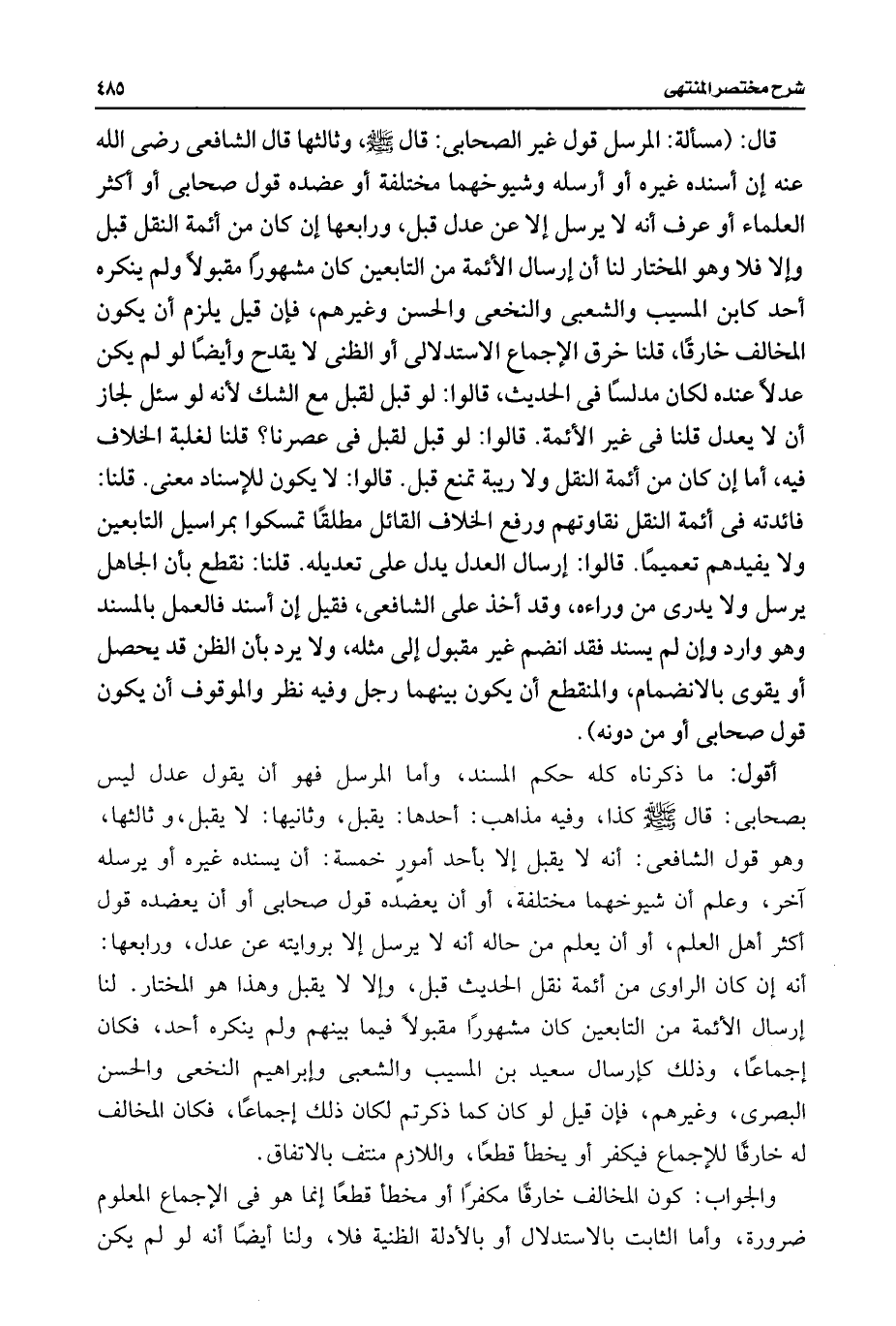 أقول: ما ذكرناه كله حكم المسند، وأما المرسل فهو أن يقول عدل ليس بصحابى: قال -صلى اللَّه عليه وسلم- كذا، وفيه مذاهب: أحدها: يقبل، وثانيها: لا يقبل، وثالثها، وهو قول الشافعى: أنه لا يقبل إلا بأحد أمورٍ خمسة: أن يسنده غيره أو يرسله آخر، وعلم أن شيوخهما مختلفة، أو أن يعضده قول صحابى أو أن يعضده قول أكثر أهل العلم، أو أن يعلم من حاله أنه لا يرسل إلا بروايته عن عدل، ورابعها: أنه إن كان الراوى من أئمة نقل الحديث قبل، وإلا لا يقبل وهذا هو المختار. لنا إرسال الأئمة من التابعين كان مشهورًا مقبولًا فيما بينهم ولم ينكره أحد، فكان إجماعًا، وذلك كإرسال سعيد بن المسيب والشعبى وإبراهيم النخعى والحسن البصرى، وغيرهم، فإن قيل لو كان كما ذكرتم لكان ذلك إجماعًا، فكان المخالف له خارقًا للإجماع فيكفر أو يخطأ قطعًا، واللازم منتف بالاتفاق.