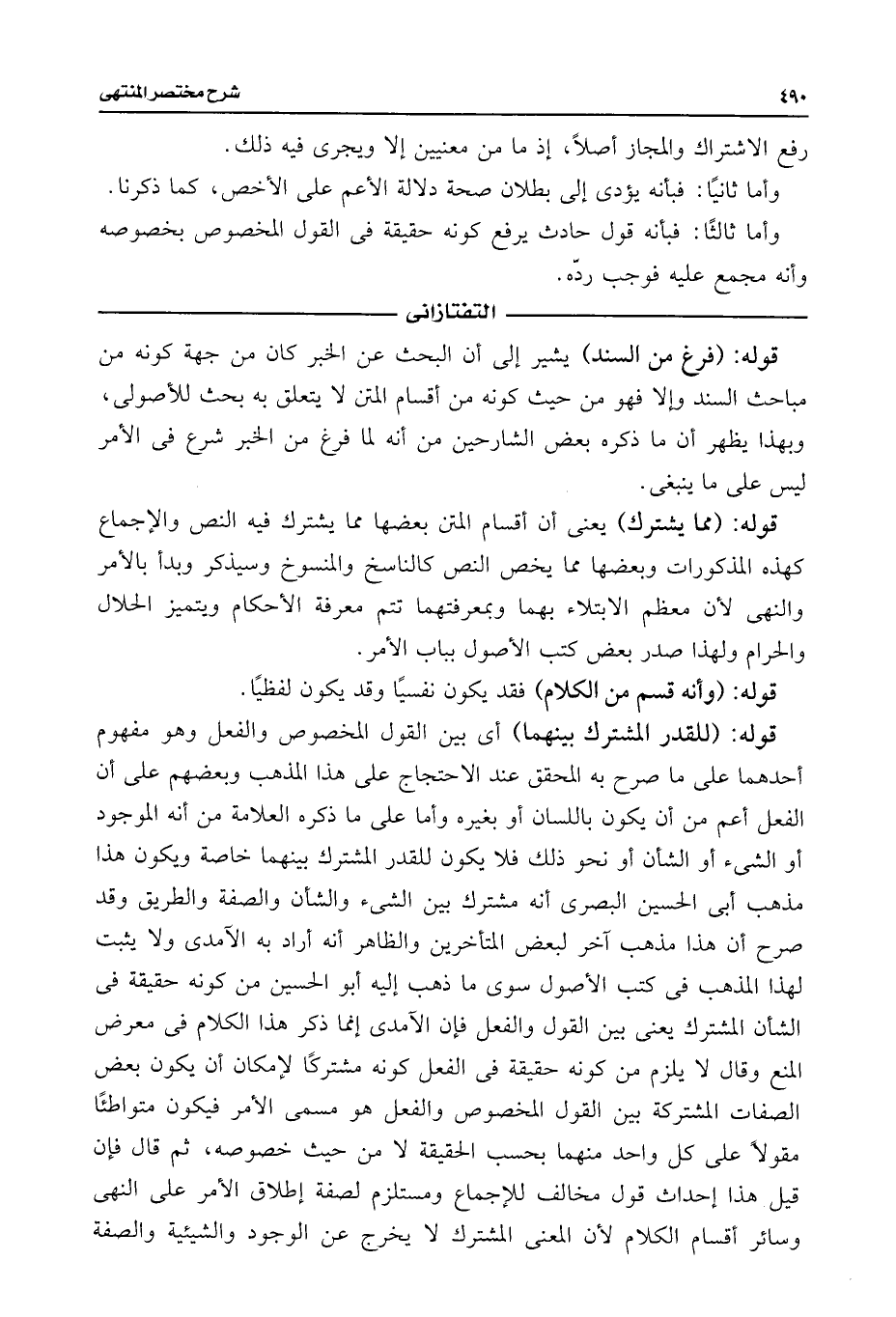 قوله: (للقدر المشترك بينهما) أى بين القول المخصوص والفعل وهو مفهوم أحدهما على ما صرح به المحقق عند الاحتجاج على هذا المذهب وبعضهم على أن الفعل أعم من أن يكون باللسان أو بغيره وأما على ما ذكره العلامة من أنه الموجود أو الشئ أو الشأن أو نحو ذلك فلا يكون للقدر المشترك بينهما خاصة ويكون هذا مذهب أبى الحسين البصرى أنه مشترك بين الشئ والشأن والصفة والطريق وقد صرح أن هذا مذهب آخر لبعض المتأخرين والظاهر أنه أراد به الآمدى ولا يثبت لهذا المدهب فى كتب الأصول سوى ما ذهب إليه أبو الحسين من كونه حقيقة فى الشأن المشترك يعنى بين القول والفعل فإن الآمدى إنما ذكر هذا الكلام فى معرض المنع وقال لا يلزم من كونه حقيقة فى الفعل كونه مشتركًا لإمكان أن يكون بعض الصفات المشتركة بين القول المخصوص والفعل هو مسمى الأمر فيكون متواطئًا مقولًا على كل واحد منهما بحسب الحقيقة لا من حيث خصوصه، ثم قال فإن قيل هذا إحداث قول مخالف للإجماع ومستلزم لصفة إطلاق الأمر على النهى وسائر أقسام الكلام لأن المعنى المشترك لا يخرج عن الوجود والشيئية والصفة