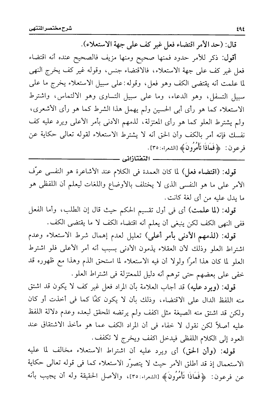 أقول: ذكر للأمر حدود فمنها صحيح ومنها مزيف فالصحيح عنده أنه اقتضاء فعل غير كف على جهة الاستعلاء، فالاقتضاء جنس، وقوله غير كف يخرج النهى لما علمت أنه يقتضى الكف وهو فعل، وقوله: على سبيل الاستعلاء يخرج ما على سبيل التسفل، وهو الدعاء، وما على سبيل التساوى وهو الالتماس، واشترط الاستعلاء كما هو رأى أبى الحسين ولم يهمل هذا الشرط كما هو رأى الأشعري، ولم يشترط العلو كما هو رأى المعتزلة، لذمهم الأدنى بأمر الأعلى ويرد عليه كف نفسك فإنه أمر بالكف وأن الحق أنه لا يشترط الاستعلاء لقوله تعالى حكاية عن فرعون: {فَمَاذَا تَأْمُرُونَ} [الشعراء: ٣٥].