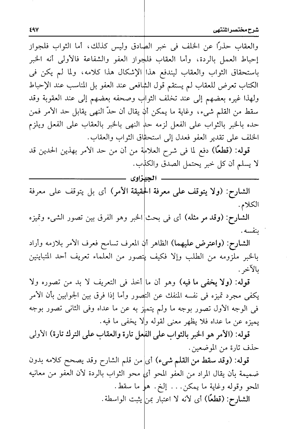 والعقاب حذرًا عن الخلف فى خبر الصادق وليس كذلك، أما الثواب فلجواز إحباط العمل بالردة، وأما العقاب فلجواز العفو والشفاعة فالأولى أنه الخبر باستحقاق الثواب والعقاب ليندفع هذا الإشكال هذا كلامه، ولما لم يكن فى الكتاب تعرض للعقاب لم يستقم قول الشافعى عند العفو بل المناسب عند الإحباط ولهذا غيره بعضهم إلى عند تخلف الثواب وصحفه بعضهم إلى عند العقوبة وقد سقط من القلم شئ، وغاية ما يمكن أن يقال أن حدّ النهى يقابل حد الأمر فمن حده بالخبر بالثواب على الفعل لزمه حد النهى بالخبر بالعقاب على الفعل ويلزم الخلف على تقدير العفو فعدل إلى استحقاق الثواب والعقاب.