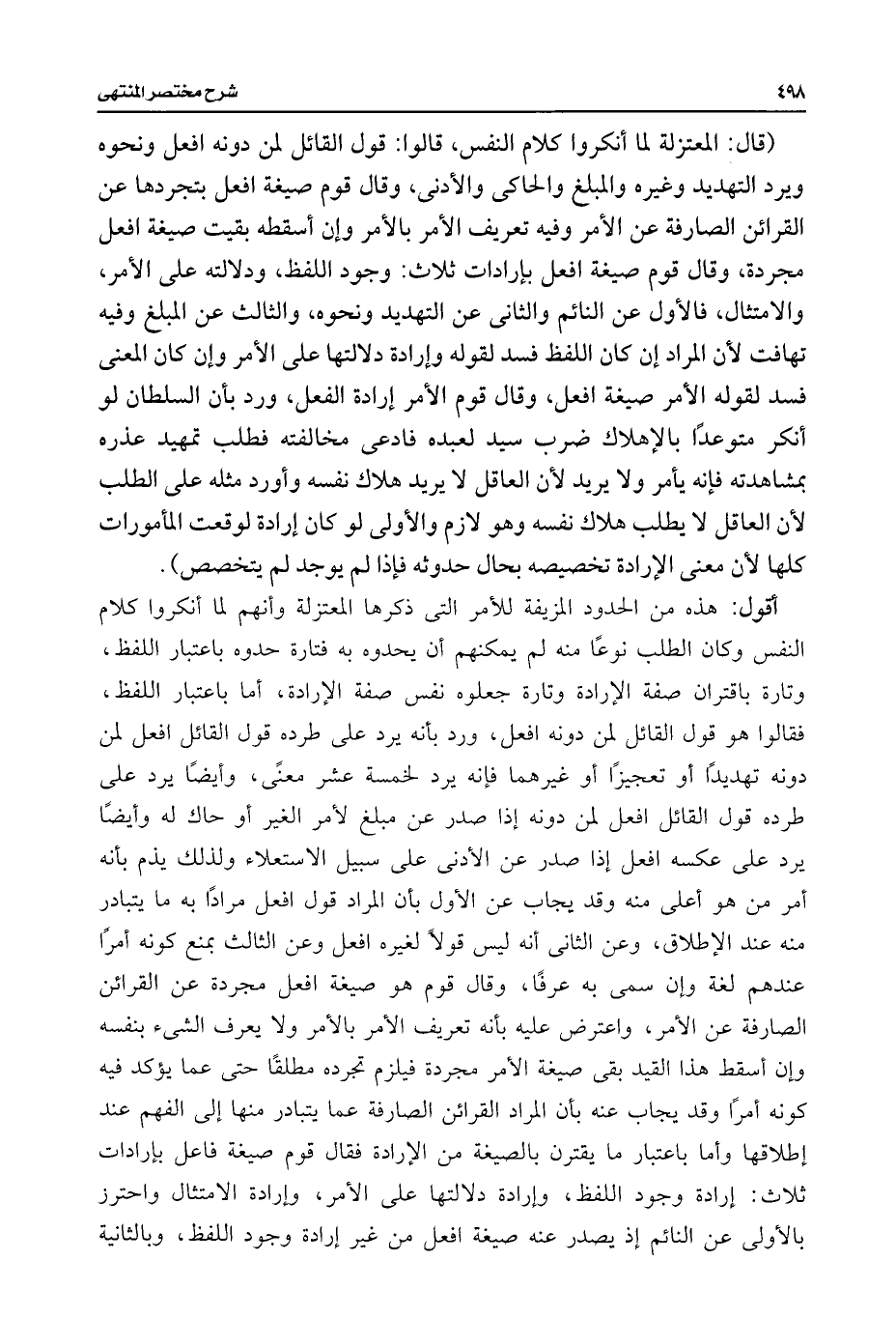 (قال: المعتزلة لما أنكروا كلام النفس، قالوا: قول القائل لمن دونه افعل ونحوه ويرد التهديد وغيره والمبلغ والحاكى والأدنى، وقال قوم صيغة افعل بتجردها عن القرائن الصارفة عن الأمر وفيه تعريف الأمر بالأمر وإن أسقطه بقيت صيغة افعل مجردة، وقال قوم صيغة افعل بإرادات ثلاث: وجود اللفظ، ودلالته على الأمر، والامتثال، فالأول عن النائم والثانى عن التهديد ونحوه، والثالث عن المبلغ وفيه تهافت لأن المراد إن كان اللفظ فسد لقوله وإرادة دلالتها على الأمر وإن كان المعنى فسد لقوله الأمر صيغة افعل، وقال قوله الأمر إرادة الفعل، ورد بأن السلطان لو أنكر متوعدًا بالإهلاك ضرب سيد لعبده فادعى مخالفته فطلب تمهيد عذره بمشاهدته فإنه يأمر ولا يريد لأن العاقل لا يريد هلاك نفسه وأورد مثله على الطلب لأن العاقل لا يطلب هلاك نفسه وهو لازم والأولى لو كان إرادة لوقعت المأمورات كلها لأن معنى الإرادة تخصيصه بحال حدوثه فإذا لم يوجد لم يتخصص).