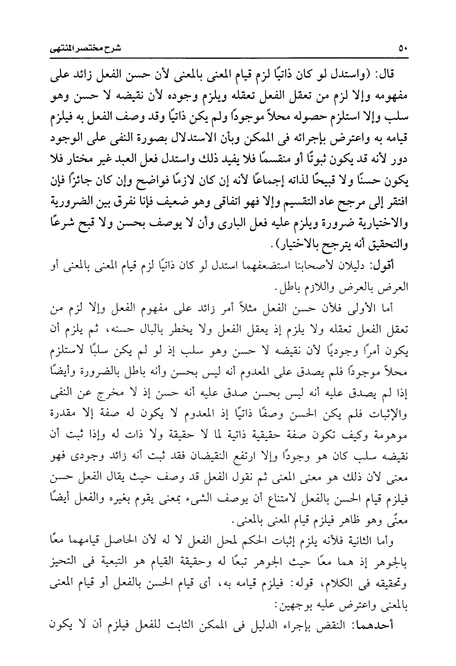 قال: (واستدل لو كان ذاتيًا لزم قيام المعنى بالمعنى لأن حسن الفعل زائد على مفهومه وإلا لزم من تعقل الفعل تعقله ويلزم وجوده لأن نقيضه لا حسن وهو سلب وإلا استلزم حصوله محلًا موجودًا ولم يكن ذاتيًا وقد وصف الفعل به فيلزم قيامه به واعترض بإجرائه فى الممكن وبأن الاستدلال بصورة النفى على الوجود دور لأنه قد يكون ثبوتًا أو منقسمًا فلا يفيد ذلك واستدل فعل العبد غير مختار فلا يكون حسنًا ولا قبيحًا لذاته إجماعًا لأنه إن كان لازمًا فواضح وإن كان جائزًا فإن افتقر إلى مرجح عاد التقسيم وإلا فهو اتفاقى وهو ضعيف فإنا نفرق بين الضرورية والاختيارية ضرورة ويلزم عليه فعل البارى وأن لا يوصف بحسن ولا قبح شرعًا والتحقيق أنه يترجح بالاختيار).