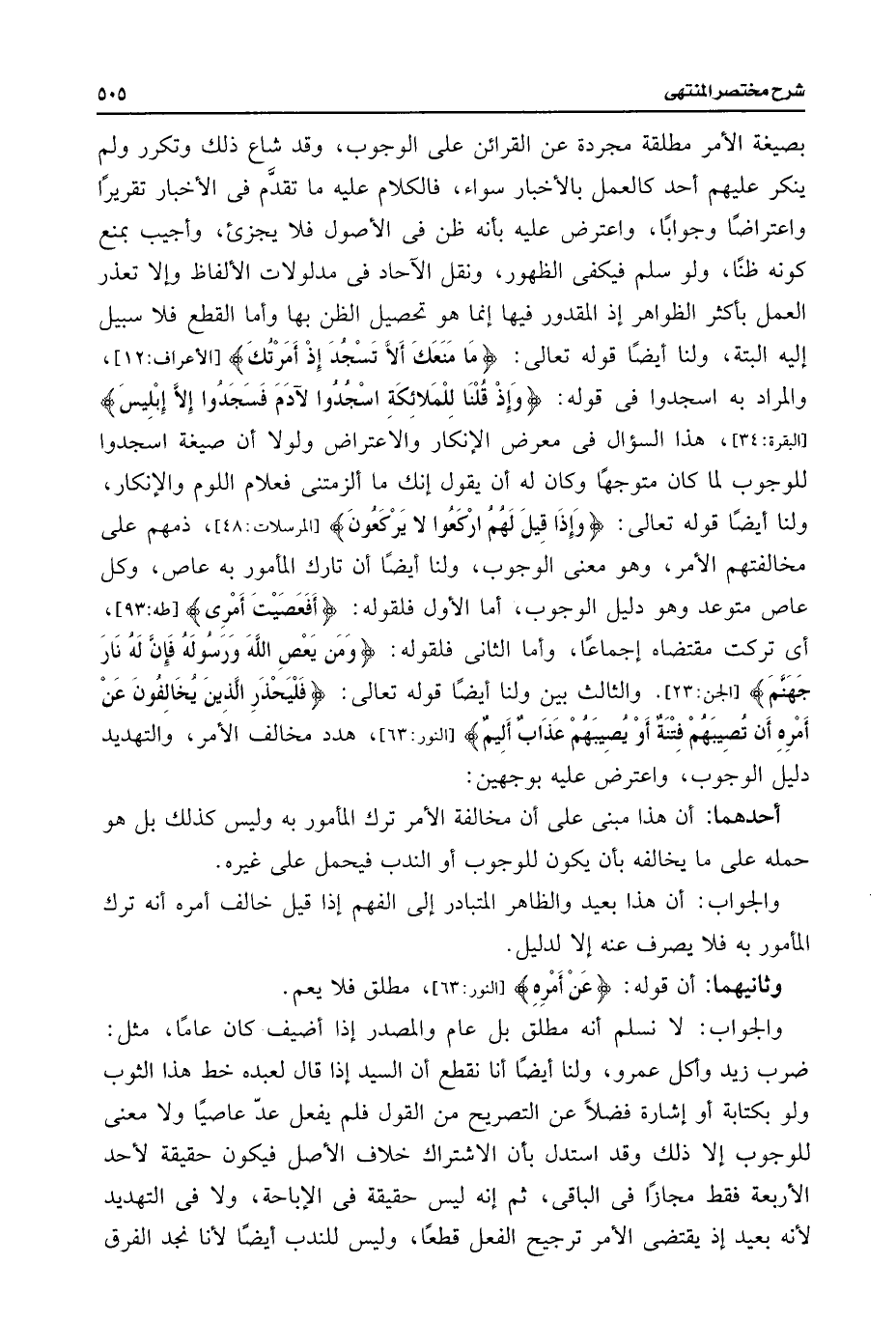 بصيغة الأمر مطلقة مجردة عن القرائن على الوجوب، وقد شاع ذلك وتكرر ولم ينكر عليهم أحد كالعمل بالأخبار سواء، فالكلام عليه ما تقدَّم فى الأخبار تقريرًا واعتراضًا وجوابًا، واعترض عليه بأنه ظن فى الأصول فلا يجزئ، وأجيب بمنع كونه ظنًا، ولو سلم فيكفى الظهور، ونقل الآحاد فى مدلولات الألفاظ وإلا تعذر العمل بأكثر الظواهر إذ المقدور فيها إنما هو تحصيل الظن بها وأما القطع فلا سبيل إليه البتة، ولنا أيضًا قوله تعالى: {مَا مَنَعَكَ أَلَّا تَسْجُدَ إِذْ أَمَرْتُكَ} [الأعراف: ١٢]، والمراد به اسجدوا فى قوله: {وَإِذْ قُلْنَا لِلْمَلَائِكَةِ اسْجُدُوا لِآدَمَ فَسَجَدُوا إِلَّا إِبْلِيسَ} [البقرة: ٣٤]، هذا السؤال فى معرض الإنكار والاعتراض ولولا أن صيغة اسجدوا للوجوب لما كان متوجهًا وكان له أن يقول إنك ما ألزمتنى فعلام اللوم والإنكار، ولنا أيضًا قوله تعالى: {وَإِذَا قِيلَ لَهُمُ ارْكَعُوا لَا يَرْكَعُونَ} [المرسلات: ٤٨]، ذمهم على مخالفتهم الأمر، وهو معنى الوجوب، ولنا أيضًا أن تارك المأمور به عاص، وكل عاص متوعد وهو دليل الوجوب، أما الأول فلقوله: {أَفَعَصَيْتَ أَمْرِي} [طه: ٩٣]، أى تركت مقتضاه إجماعًا، وأما الثانى فلقوله: {وَمَنْ يَعْصِ اللَّهَ وَرَسُولَهُ فَإِنَّ لَهُ نَارَ جَهَنَّمَ} [الجن: ٢٣]. والثالث بين ولنا أيضًا قوله تعالى: {فَلْيَحْذَرِ الَّذِينَ يُخَالِفُونَ عَنْ أَمْرِهِ أَنْ تُصِيبَهُمْ فِتْنَةٌ أَوْ يُصِيبَهُمْ عَذَابٌ أَلِيمٌ} [النور: ٦٣]، هدد مخالف الأمر، والتهديد دليل الوجوب، واعترض عليه بوجهين: