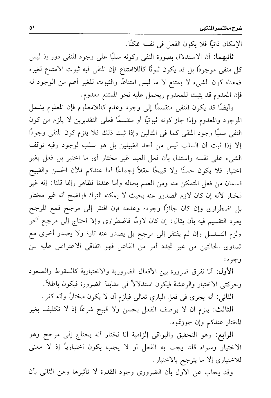 وأيضًا قد يكون المنفى منقسمًا إلى وجود وعدم كاللامعلوم فإن المعلوم يشمل الموجود والمعدوم وإذا جاز كونه ثبوتيًا أو منقسمًا فعلى التقديرين لا يلزم من كون النفى سلبًا وجود المنفى كما فى المثالين وإذا ثبت ذلك فلا يلزم كون المنفى وجودًا إلا إذا ثبت أن السلب ليس من أحد القبيلين بل هو سلب لوجود وفيه توقف الشئ على نفسه واستدل بأن فعل العبد غير مختار أى ما اختير بل فعل بغير اختيار فلا يكون حسنًا ولا قبيحًا عقلًا إجماعًا أما عندكم فلأن الحسن والقبيح قسمان من فعل المتمكن مضه ومن العلم بحاله وأما عندنا فظاهر وإنما قلنا: إنه غير مختار لأنه إن كان لازم الصدور عنه بحيث لا يمكنه الترك فواضح أنه غير مختار بل اضطرارى وإن كان جائزًا وجوده وعدمه فإن افتقر إلى مرجح فمع المرجح يعود التقسيم فيه بأن يقال: إن كان لازمًا فاضطرارى وإلا احتاج إلى مرجح آخر ولزم التسلسل كان لم يفتقر إلى مرجح بل يصدر عنه تارة ولا يصدر أخرى مع تساوى الحالتين من غير تجدد أمر من الفاعل فهو اتفاقى الاعتراض عليه من وجوه: