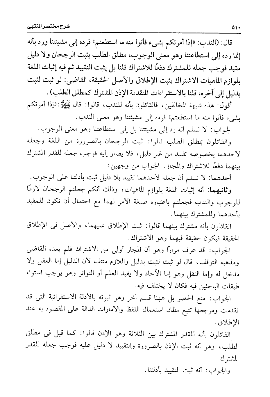 قال: (الندب: "إذا أمرتكم بشئ فأتوا منه ما استطعتم" فرده إلى مشيئتنا ورد بأنه إنما رده إلى استطاعتنا وهو معنى الوجوب، مطلق الطلب يثبت الرجحان ولا دليل مقيد فوجب جعله للمشترك دفعًا للاشتراك قلنا بل يثبت التقييد ثم فيه إثبات اللغة بلوازم الماهيات الاشتراك يثبت الإطلاق والأصل الحقيقة، القاضى: لو ثبت لثبت بدليل إلى آخره، قلنا بالاستقراءات المتقدمة الإذن المشترك كمطلق الطلب).
