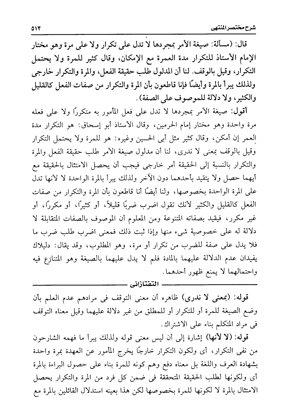 قال: (مسألة: صيغة الأمر بمجردها لا تدل على تكرار ولا على مرة وهو مختار الإمام الأستاذ للتكرار مدة العمرة مع الإمكان، وقال كثير للمرة ولا يحتمل التكرار، وقيل بالوقف. لنا أن المدلول طلب حقيقة الفعل، والمرة والتكرار خارجى ولذلك يبرأ بالمرة وأيضًا فإنا قاطعون بأن المرة والتكرار من صفات الفعل كالقليل والكثير، ولا دلالة للموصوف على الصفة).