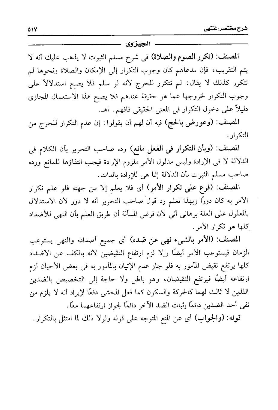 المصنف: (تكرر الصوم والصلاة) فى شرح مسلم الثبوت لا يذهب عليك أنه لا يتم التقريب، فإن مدعاهم كان وجوب التكرار إلى الإمكان والصلاة ونحوها لم تتكرر كذلك لا يقال: لم تتكرر للحرج لأنه لو سلم فلا يصح استدلالًا على وجوب التكرار لخروجها عما هو حقيقة عندهم فلا يصح هذا الاستعمال المجازى دليلًا على دخول التكرار فى المعنى الحقيقى فافهم. اهـ.