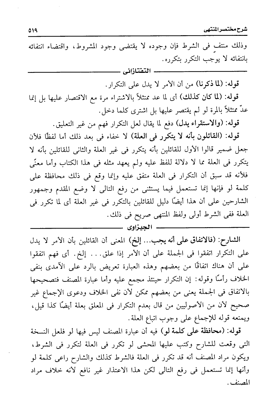 قوله: (القائلون بأنه لا يتكرر فى العلة) لا خفاء فى بعد ذلك أما لفظًا فلأن جعل ضمير قالوا الأول للقائلين بأنه يتكرر فى غير العلة والثانى للقائلين بأنه لا يتكرر فى العلة مما لا دلالة للفظ عليه ولم يعهد مثله فى هذا الكتاب وأما معنًى فلأنه قد سبق أن التكرار فى العلة متفق عليه وإنما وقع فى ذلك محافظة على كلمة لو فإنها إنما تستعمل فيما يستثنى من رفع التالى لا وضع المقدم وجمهور الشارحين على أن هذا أيضًا دليل للقائلين بالتكرر فى غير العلة أى لما تكرر فى العلة ففى الشرط أولى ولفظ المنتهى صريح فى ذلك.